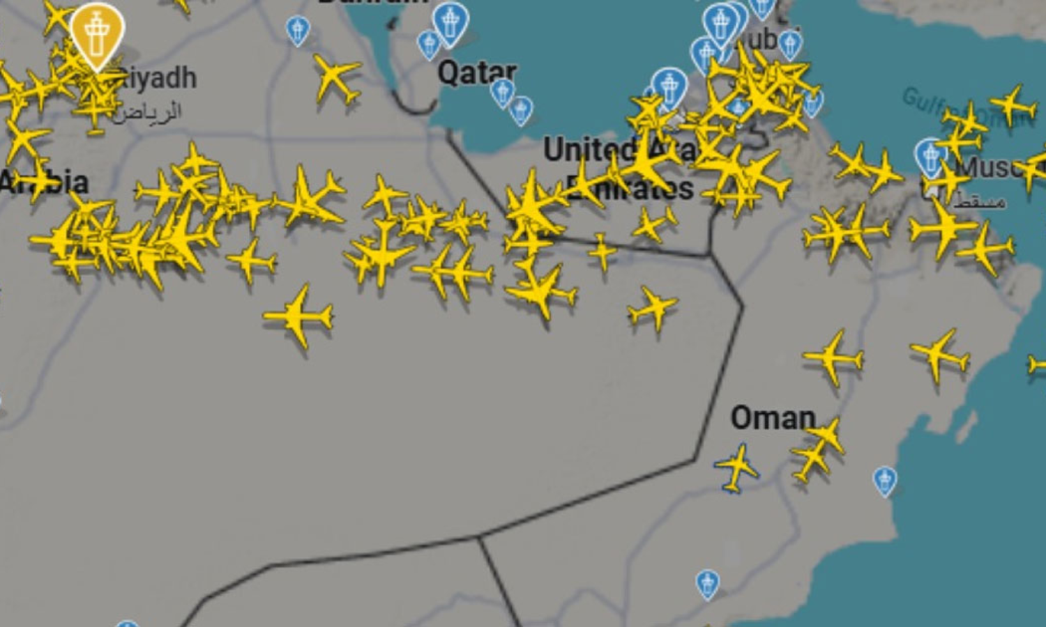 അതേസമയം, മാർച്ച് 10 ന് മസ്കത്തിൽ നിന്ന് 56 വിമാനങ്ങളും ദോഹയിൽ നിന്ന് 15 വിമാനങ്ങളും അബൂദബിയിൽ നിന്ന് 27 വിമാനങ്ങളും ദുബൈയിൽ നിന്ന് 161 വിമാനങ്ങളും പുറപ്പെട്ടതായാണ് വ്യോമയാന അനലിറ്റിക്സ് കമ്പനിയായ സിറിയം പറയുന്നത്.