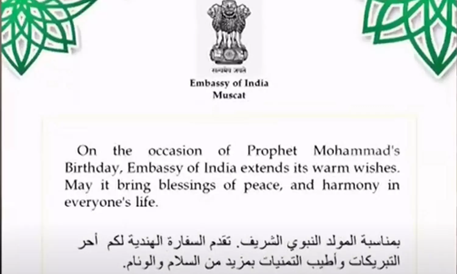 നബിദിനാശംസകൾ നേർന്ന് മസ്കത്ത് ഇന്ത്യൻ എംബസി