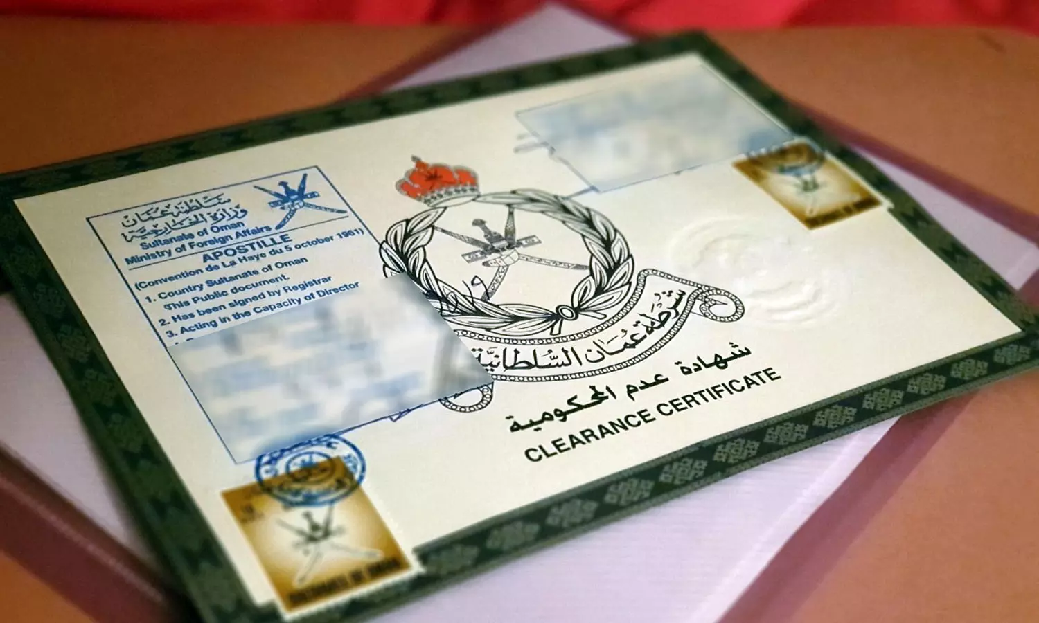 സുൽത്താനേറ്റിന് പുറത്തുള്ള വിദേശികൾക്ക്, അവർ ഒമാനിലേക്ക് പ്രവേശിക്കാൻ ഉപയോഗിച്ച അവസാന പാസ്പോർട്ടും ഒമാനിൽ താമസിക്കുന്ന കാലയളവിൽ സിവിൽ സ്റ്റാറ്റസ് പ്രകാരം നൽകിയ സിവിൽ നമ്പറും നൽകണം. പൊലീസ് ക്ലിയറൻസ് സർട്ടിഫിക്കറ്റ് ലഭിക്കുന്നതിന് പൗരന്മാരിൽ നിന്ന് മൂന്ന് റിയാലും പ്രവാസികളിൽ നിന്ന് 20റിയാലും ഈടാക്കും.