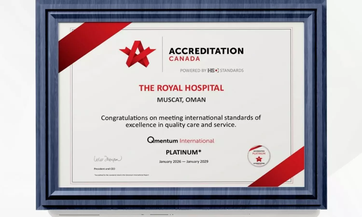 മസ്കത്ത്: ഒമാനിലെ റോയൽ ഹോസ്പിറ്റലിന് കാനഡയിലെ ഇന്റർനാഷണൽ അക്രഡിറ്റേഷൻ ബോഡിയിൽ നിന്ന് 2026-ൽ പ്ലാറ്റിനം അക്രഡിറ്റേഷൻ. തുടർച്ചയായി രണ്ടാം തവണയാണ് ആശുപത്രിക്ക് ഈ ഉന്നത അംഗീകാരം ലഭിക്കുന്നത്. 2016 ലും 2019 ലും ആശുപത്രി ഗോൾഡ് ലെവൽ അക്രഡിറ്റേഷൻ നേടിയിരുന്നു, 2023 ൽ പ്ലാറ്റിനം ലെവലിലേക്ക് മുന്നേറി. 2026 ലും ഇത് നേടുകയായിരുന്നു.
