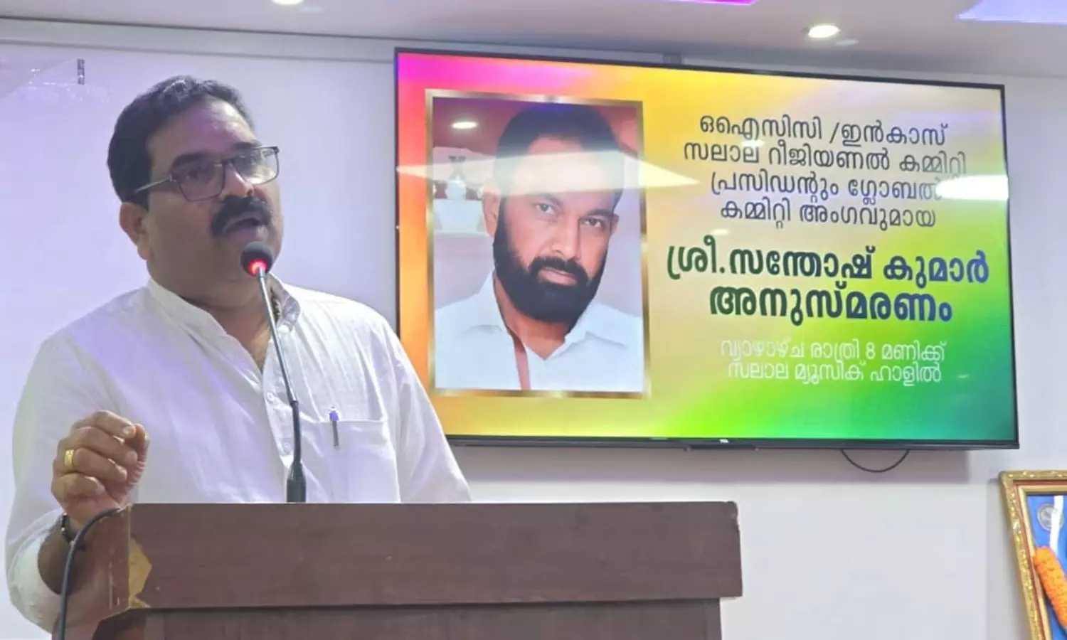സലാല: ഇൻകാസ് സലാല പ്രസിഡന്റും ഒ.ഐ.സി.സി യുടെ ആദ്യകാല നേതാവുമായിരുന്ന സന്തോഷ് കുമാറിനെ സലാലയിലെ കോൺഗ്രസ് പ്രവർത്തകർ ഒത്തുചേർന്ന് അനുസ്മരിച്ചു. ഇൻകാസും ഐ.ഒ.സിയും സംയുക്തമായി മ്യൂസിക് ഹാളിൽ സംഘടിപ്പിച്ച പരിപാടി ഐ.ഒ.സി പ്രസിഡന്റ് ഡോ. നിഷ്താർ ഉദ്ഘാടനം ചെയ്തു. ഇൻകാസ് നാഷണൽ കമ്മിറ്റിയംഗം ബാബു കുറ്റ്യാടി അധ്യക്ഷത വഹിച്ചു. മൗന പ്രാർത്ഥനയോടെ തുടങ്ങിയ യോഗത്തിൽ ഹരികുമാർ ചേർത്തലയും വിവിധ സംഘടന പ്രതിനിധികളും ആദരാഞ്ജലികൾ അർപ്പിച്ച് സംസാരിച്ചു. ഇൻകാസ് നാഷണൽ കമ്മിറ്റി അംഗം ദീപക് മോഹൻദാസ്, ജനറൽ സെക്രട്ടറി അജിത് മജീന്ദ്രൻ, ഐഒസി നേതാകളായ ശ്യാം മോഹൻ, റിസാൻ എന്നിവർ നേതൃത്വം നൽകി.