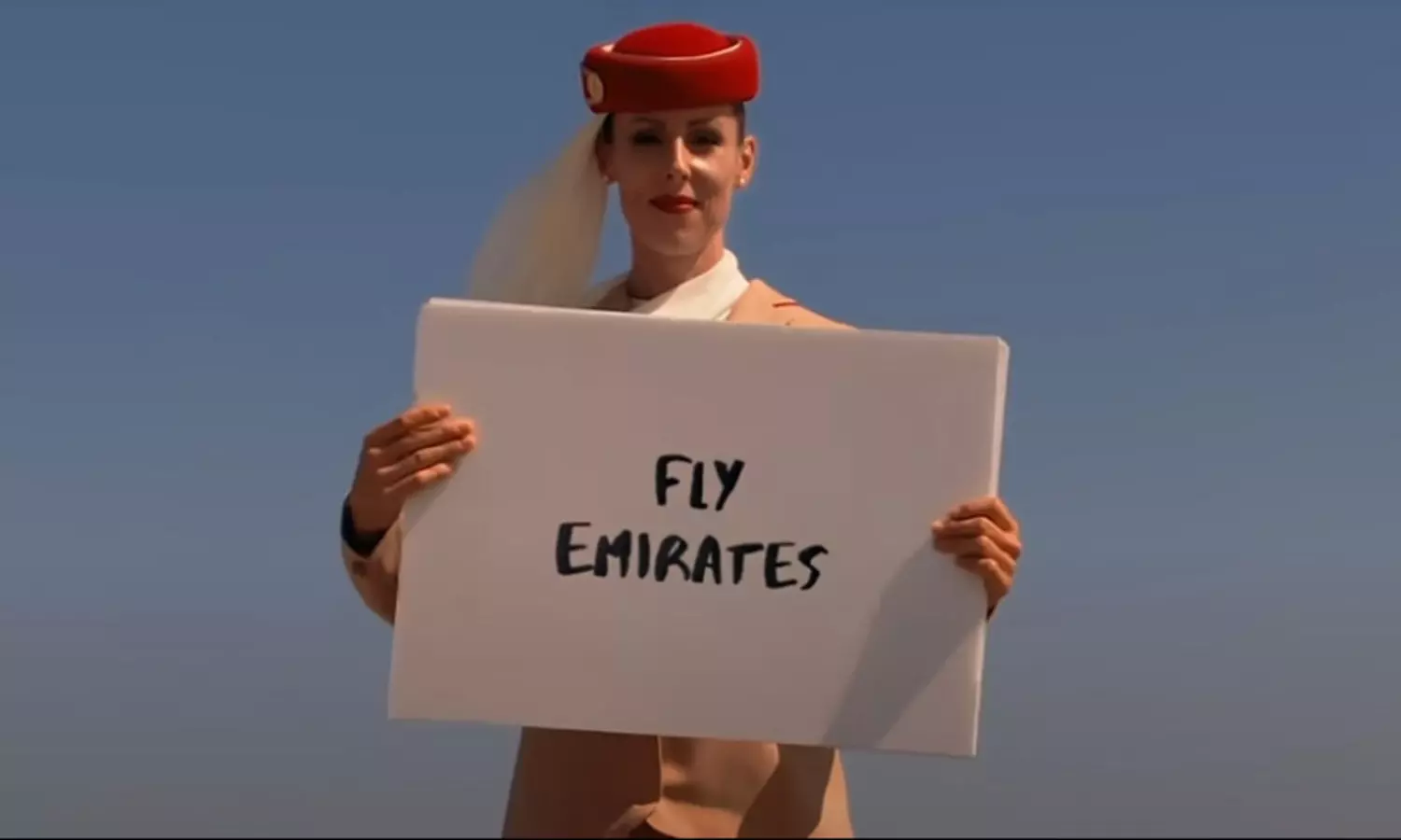 പരസ്യ ചിത്രത്തിനായി ഇവരെ ഹെലികോപ്ടറിലാണ് ബുർജ് ഖലീഫയ്ക്ക് മുകളിലെത്തിച്ചത്. എമിറേറ്റ്സിന്റെ പരമ്പരാഗത കാബിൻ ക്രൂ വേഷം അണിഞ്ഞെത്തിയ ഇവർ 'ലോകത്തിന്റെ മുകളിൽ ഫ്ളൈ എമിറേറ്റ്സ്' എന്ന സന്ദേശമാണ് പങ്കുവയ്ക്കുന്നത്. യുകെയിലേക്കുള്ള യാത്ര പുനരാരംഭിച്ചതിന്റെ ഭാഗമായായിരുന്നു പരസ്യ ചിത്രം.