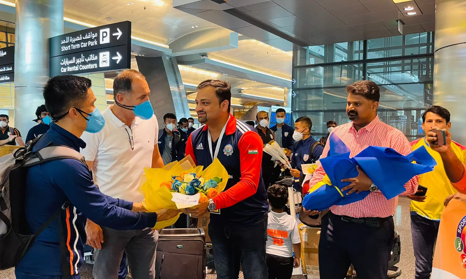 ജോര്ദാനെതിരായ സൗഹൃദ മത്സരത്തിനായി ഇന്ത്യന് ഫുട്ബോള് ടീം ഖത്തറില് എത്തി. ദോഹ ഹമദ് രാജ്യാന്തര വിമാനത്താവളത്തില് എത്തിയ ടീമീന് ഇന്ത്യന് സ്പോര്ട്സ് സെന്ററും മഞ്ഞപ്പടയും സ്വീകരണം നല്കി.