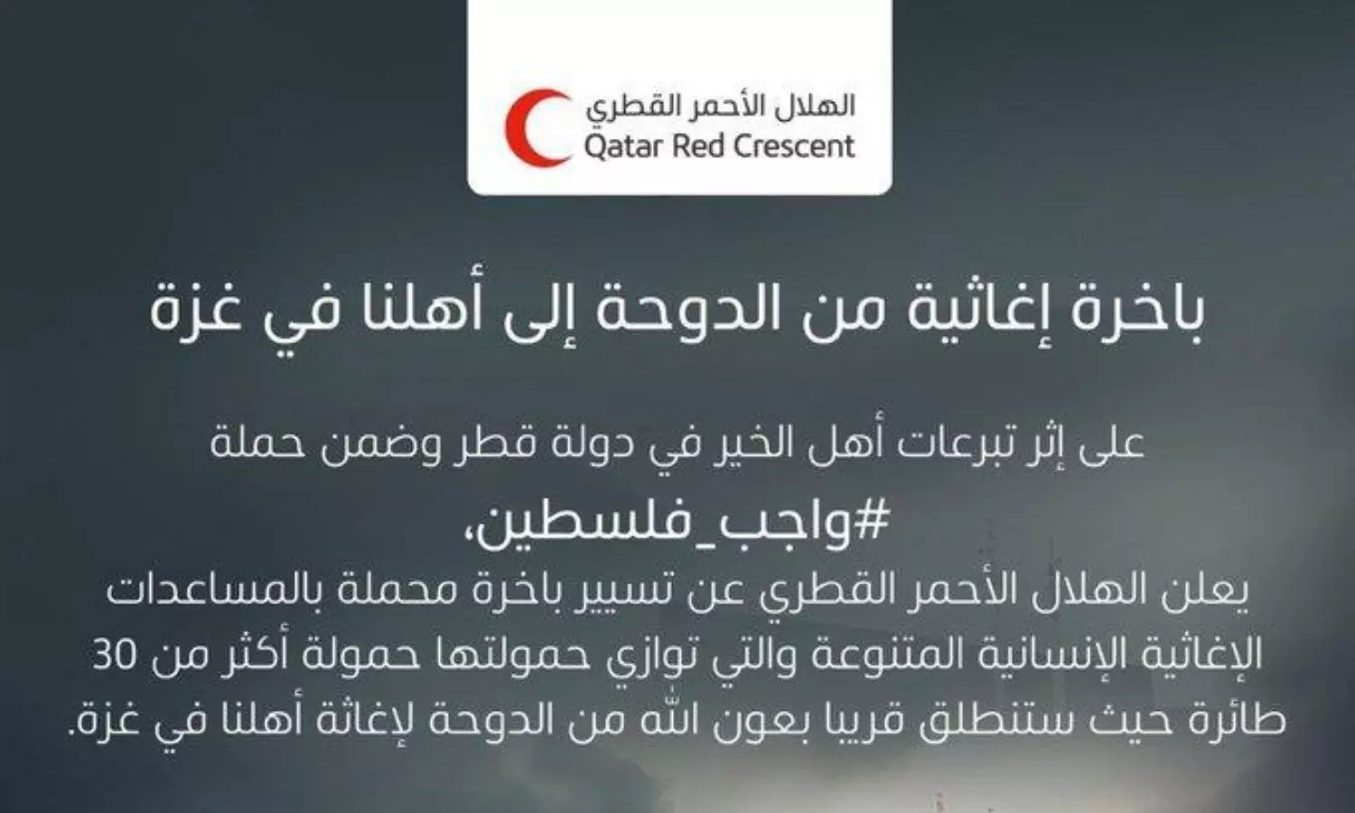 ഡിസംബർ 13 ന് ദോഹയുടെ വിദേശകാര്യ മന്ത്രാലയം പങ്കിട്ട കണക്കുകൾ പ്രകാരം 1,464 ടൺ സഹായവുമായി ഖത്തർ ഇതുവരെ 44 ഖത്തർ സായുധ സേനാ വിമാനങ്ങൾ ഈജിപ്തിലെ എൽ അരിഷ് എയർപോർട്ടിലേക്ക് അയച്ചിട്ടുണ്ട്.
