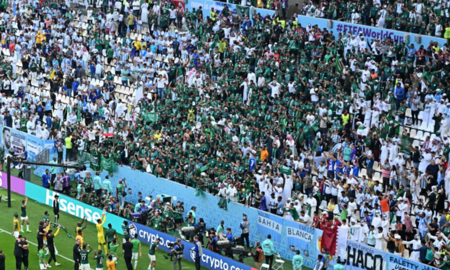 ഖത്തറിൽ അർജന്റീനക്കെതിരായ ചരിത്ര വിജയം ആഘോഷിക്കുന്ന സൗദി ആരാധകരോടൊപ്പം മറ്റു അറബ് രാജ്യങ്ങളിൽനിന്നുള്ളവരും മെക്സിക്കൻ ആരാധകരും പങ്കുചേർന്നു. മത്സരം തുടങ്ങും മുമ്പേ അർജന്റീനൻ ആരാധകരാണ് ആരവം തുടങ്ങിയിരുന്നത്. ഗാലറികളിലും ഫാൻസോണുകളിലും ആവേശമിരമ്പിയിരുന്നു. മെസ്സിയുടെ നീക്കങ്ങൾക്കെല്ലാം എല്ലാവരും ചേർന്ന് നിറഞ്ഞ കയ്യടി നൽകിയിരുന്നു.