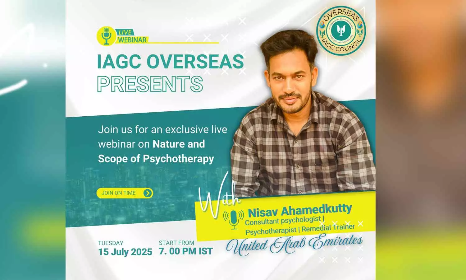 ദമ്മാം: ഇന്റർ നാഷണൽ അസോസിയേഷൻ ഫോർ ഗൈഡൻസ് ആന്റ് കൗൺസിലിംഗ് (ഐഎജിസി) ഓവർസീസ് കമ്മിറ്റിയുടെ നേതൃത്വത്തിൽ 'നേച്ചർ ആന്റ് സ്കോപ്പ് ഓഫ് സൈക്കോ തെറാപ്പി' എന്ന വിഷയത്തിൽ ആരോഗ്യ ബോധവത്കരണം സംഘടിപ്പിക്കുന്നു. ഇന്ന് ഇന്ത്യൻ സമയം വൈകിട്ട് 7 മണി മുതൽ ഓൺലൈൻ വെബിനാറായാണ് പരിപാടി സംഘടിപ്പിക്കുന്നത്. കൺസർട്ടന്റ് സൈക്കോളജിസ്റ്റും, സൈക്കോ തെറാപ്പിസ്റ്റ്, റമഡിയൽ ട്രയ്നർ എന്നീ മേഘലയിൽ പ്രവർത്തിക്കുന്ന നിസവ് അഹമ്മദ് കുട്ടി ക്ലാസ് നയിക്കും.