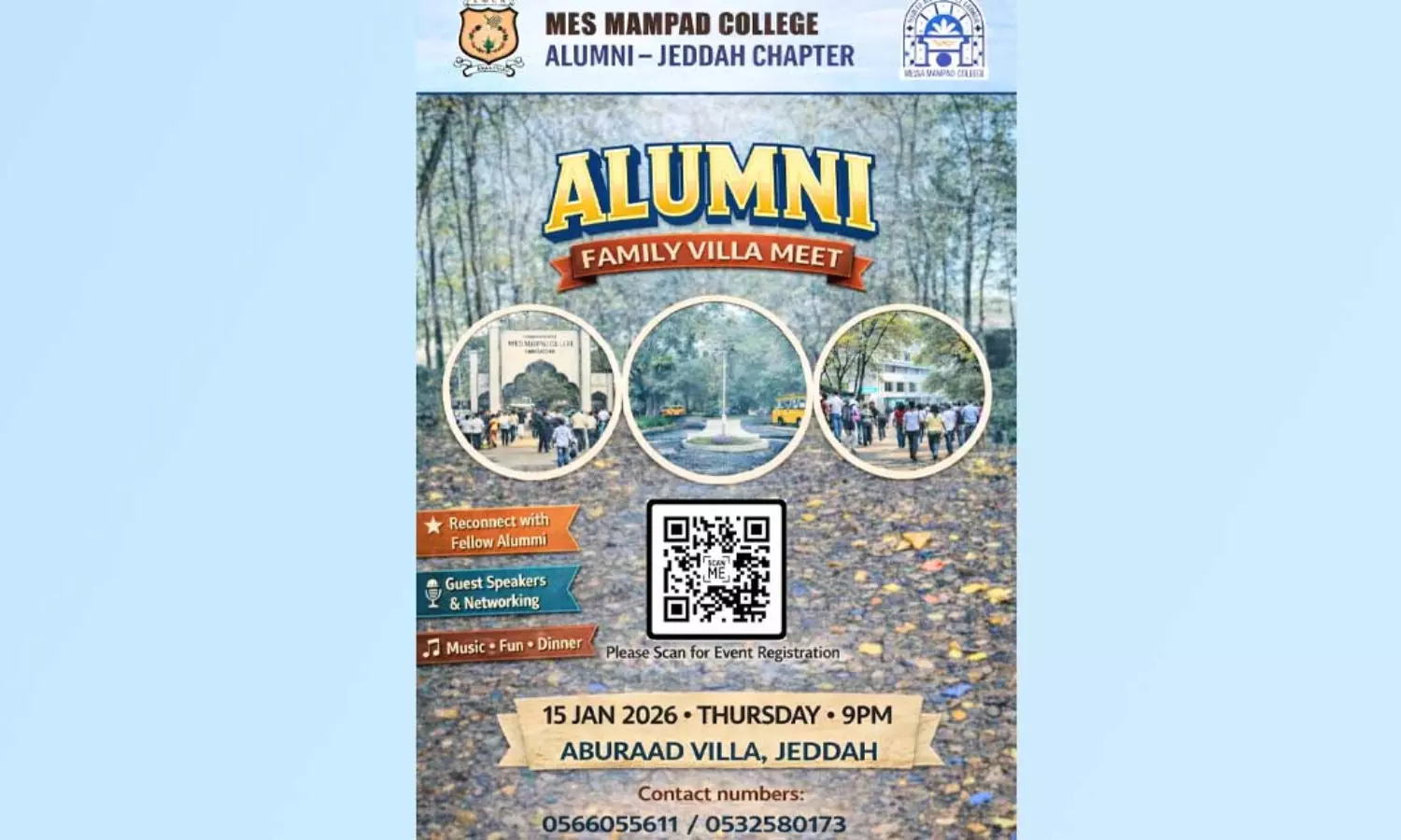 ജിദ്ദ: എം.ഇ.എസ്. മമ്പാട് കോളേജ് ജിദ്ദ ചാപ്റ്റർ അലുമ്നി മീറ്റ് നാളെ രാത്രി 9 മണിമുതൽ ആരംഭിക്കും. വാദി മുറയ്യയിലെ അബു റാദ് വില്ലയിലാണ് പരിപാടി. ജിദ്ദയിലും പരിസര പ്രദേശങ്ങളിലുമുള്ള പൂർവ വിദ്യാർത്ഥികളെയും കുടുംബങ്ങളെയും പങ്കെടുപ്പിച്ച് നടത്തുന്ന പരിപാടിയിൽ സൗഹൃദ സംഗമം, സംഗീത പരിപാടികൾ, ഒപ്പന, ഡാൻസ്, ഗെയിമുകൾ തുടങ്ങി വൈവിധ്യമാർന്ന കലാ കായിക മത്സരങ്ങൾ അരങ്ങേറുമെന്ന് ഭാരവാഹികൾ അറിയിച്ചു. ഒന്നര പതിറ്റാണ്ട് കാലമായി ജിദ്ദയിൽ പ്രവർത്തിക്കുന്ന സംഘടനക്ക് കീഴിൽ വിവിധ പ്രവർത്തനങ്ങൾ നടന്നുവരുന്നുണ്ട്.