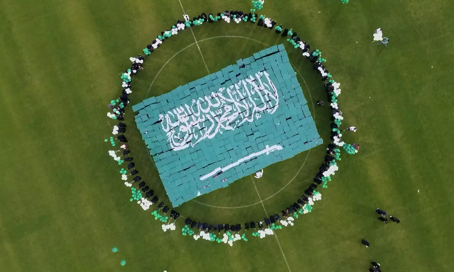 സൗദിയുടെ പതാക ദിനമാണിന്ന്. അതിന് ഐക്യദാർഢ്യം പ്രഖ്യാപിച്ചാണ് ജീവനക്കാർ ഒന്നിച്ച് ചേർന്ന് പതാകയായി മാറിയത്. ആയിരത്തോളം വരുന്ന ജീവനക്കാർ. അവരൊന്നിച്ച് ദമ്മാം സെയ്ഹാത്തിലെ അല്ഖലീജ് സ്റ്റേഡിയത്തിലെത്തി. മലയാളി ചിത്രകാരന് ഡാവിഞ്ചി സുരേഷിന്റെ മേൽനോട്ടത്തിൽ ജീവനക്കാര് ഒന്നടങ്കം അണിനിരന്നതോടെ 18 മീറ്റര് നീളവും 12 മീറ്റര് വീതിയും വരുന്ന കൂറ്റന് പതാക പിറന്നു.