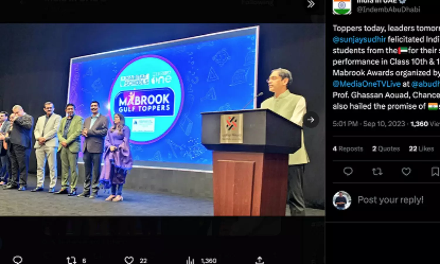 മീഡിയവൺ 'മബ്റൂഖ് ഗൾഫ് ടോപ്പേഴ്സ്'; മീഡിയവണിന് ഇന്ത്യൻ എംബസിയുടെ അഭിനന്ദനം