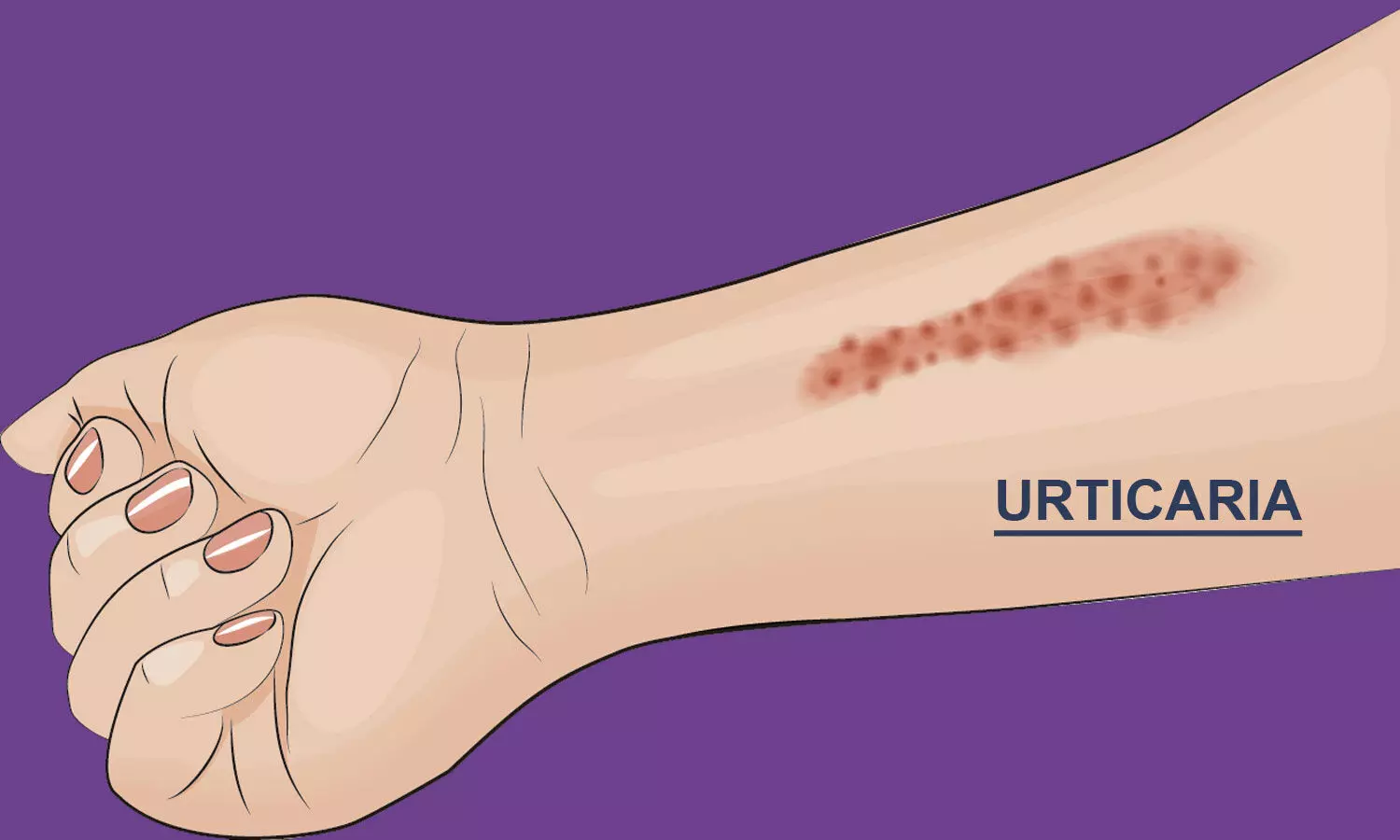 - ചർമ്മത്തിൽ ചൊറിച്ചിലോടു കൂടിയ ചുവന്ന അൽപ്പായുസുള്ള തടിപ്പുകൾ കണ്ടു വരുന്നു. മിനിറ്റുകൾ മുതൽ മണിക്കൂറുകൾക്കുള്ളിൽ ഇവ യാതൊരു പാടും ശേഷിപ്പിക്കാതെ അപ്രത്യക്ഷമാകുന്നു. ഇതിനെ അർട്ടിക്കേരിയ (urticaria) അല്ലെങ്കിൽ ഹൈവ്സ് (hives) എന്നു പറയുന്നു.