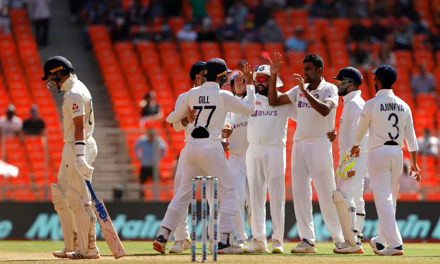 കഴിഞ്ഞ മത്സരത്തില് മാന് ഓഫ് ദ മാച്ചായ അക്സര് പട്ടേല് ഇംഗ്ലണ്ടിന്റെ നാല് മുന്നിര വിക്കറ്റുകളാണ് ഇന്നത്തെ കളിയില് പിഴുതത്. മൂന്നാം ടെസ്റ്റില് രണ്ട് ഇന്നിങ്സുകളില് നിന്നായി അക്സര് പട്ടേല് പതിനൊന്നു വിക്കറ്റുകള് വീഴ്ത്തിയിരുന്നു. ഇന്ത്യയ്ക്കായി അക്സര് പട്ടേല് നാലും രവിചന്ദ്ര അശ്വിന് മൂന്നും മുഹമ്മദ് സിറാജ് രണ്ടും വിക്കറ്റുകള് നേടി. വാഷിംഗ്ടണ് സുന്ദറിനാണ് ഒരു വിക്കറ്റ്.