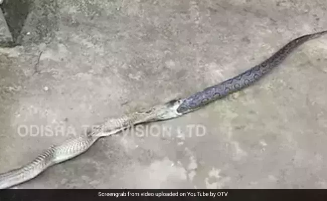 ഒഡിഷയിലെ ബാങ്കിയിലുള്ള ജനവാസ മേഖലയിലാണ് സംഭവം. ആളുകള് പാമ്പുപിടിത്തക്കാരെ വരുത്തിയാണ് ഇതു കൈകാര്യം ചെയ്തത്. സ്ഥലത്തെത്തിയ പാമ്പു പിടിത്തക്കാര് പാമ്പുകളെ പിടികൂടി അവയുടെ സ്വാഭാവിക ആവാസ വ്യവസ്ഥയിലേക്ക് തുറന്നുവിട്ടു. രക്ഷപ്പെട്ട അണലിക്ക് മൂര്ഖന്റെ വിഷത്തെ അതിജീവിക്കാന് ബുദ്ധിമുട്ടാണെന്ന് വിദഗ്ധര് പറയുന്നു.