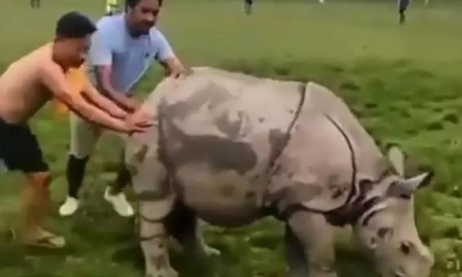 ഫുട്ബോൾ ഗ്രൗണ്ടിൽ കാണ്ടാമൃഗം കയറി; രണ്ടാൾ തള്ളിയിട്ടും പുറത്തുപോയില്ല, വീഡിയോ