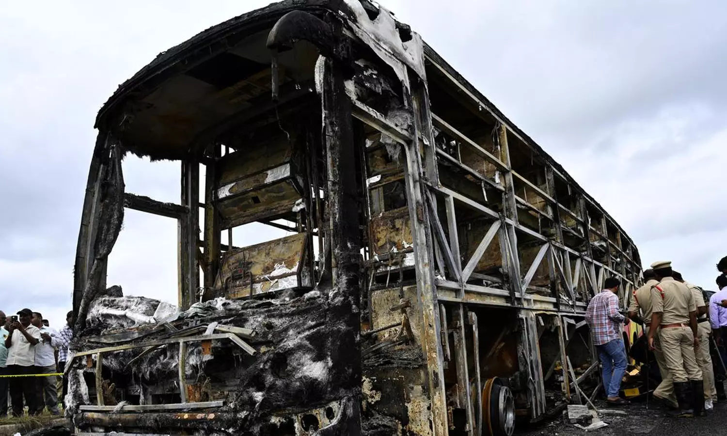 ആന്ധ്രാപ്രദേശിലെ കുർണൂലിലുണ്ടായ ബസ് തീപിടിത്തത്തിൽ കത്തിനശിച്ച ബസ് | Photo: The Hindu