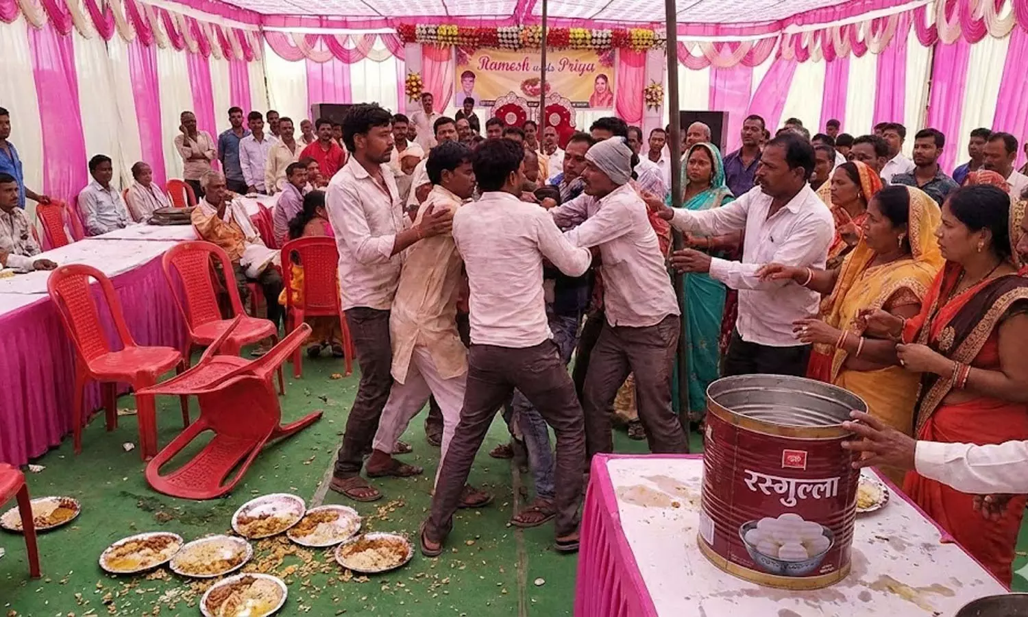 സോഷ്യൽ മീഡിയയിൽ വൈറലായ വിഡിയോയിൽ തുടക്കത്തിൽ ഭക്ഷണശാലകൾക്ക് ചുറ്റും അതിഥികൾ ഒത്തുകൂടുന്നത് കാണാം. നിമിഷങ്ങൾക്കുശേഷം ആളുകൾ കസേരകളും പ്ലേറ്റുകളും കൈയെത്താവുന്ന എന്തും പിടിച്ചെടുത്ത് പരസ്പരം ആക്രമിക്കാൻ ആരംഭിച്ചു. ഇരുവിഭാഗങ്ങളിലെയും നിരവധി പേർക്ക് പരിക്കേറ്റതായി പൊലീസ് പറഞ്ഞു. രസഗുളകളുടെ അഭാവമാണ് വഴക്കിന് കാരണമെന്ന് വരന്റെ പിതാവ് മഹേന്ദ്ര പ്രസാദ് ബുധനാഴ്ച സ്ഥിരീകരിച്ചു. വഴക്കിനുശേഷം വധുവിന്റെ കുടുംബം തങ്ങൾക്കെതിരെ വ്യാജ സ്ത്രീധന കേസ് ഫയൽ ചെയ്തതായും അദ്ദേഹം ആരോപിച്ചു.