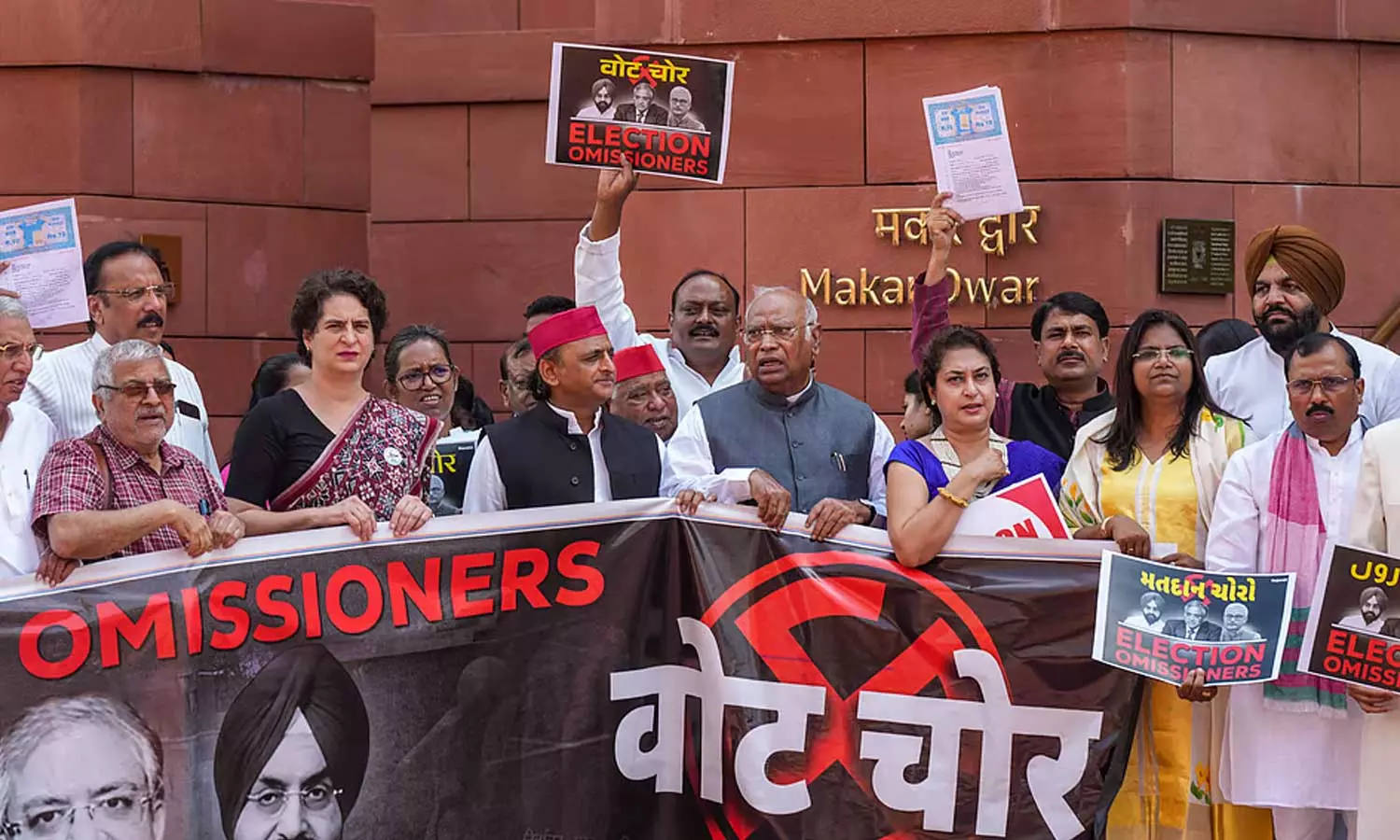 തെരഞ്ഞെടുപ്പ് കമ്മിഷണർമാർ കള്ളൻമാർ എന്നെഴുതിയ പ്ലക്കാര്ഡ് ഉയര്ത്തിയായിരുന്നു ഇന്നലത്തെ പ്രതിഷേധം. രാവിലെ പാര്ലമെന്റിന് പുറത്ത് മുഖ്യതെരഞ്ഞെടുപ്പ് കമ്മീഷണറുടെയും കമ്മിഷണർമാരുടെയും ചിത്രങ്ങൾ ഉയത്തി പ്രതിപക്ഷം പ്രതിഷേധം തീർത്തു.