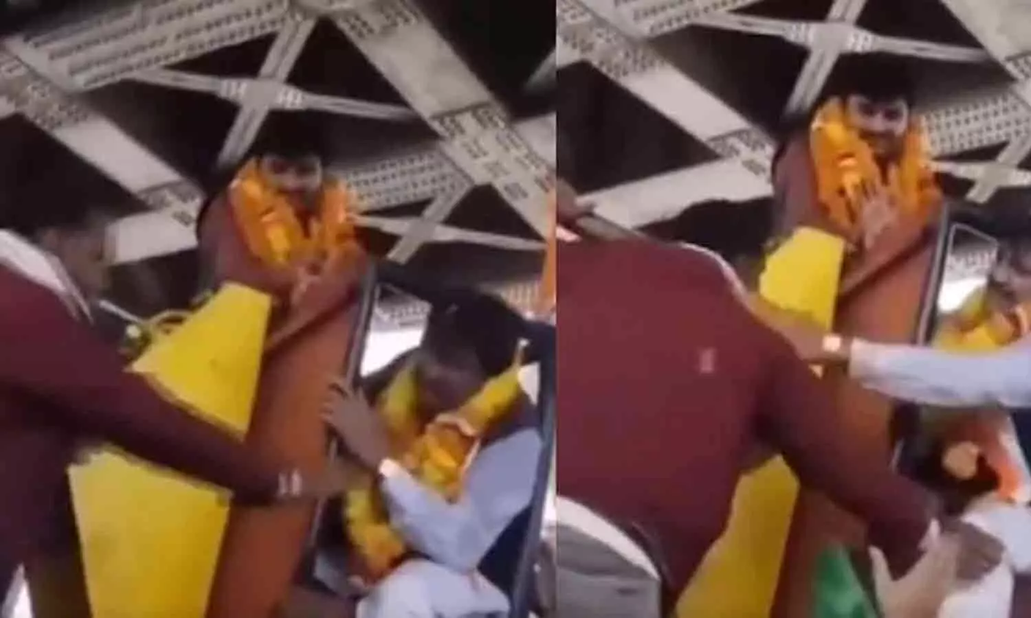 ക്രെയിനിൽ കയറി പ്രതിമയിൽ മാലയിടൽ; ക്രെയിൻ കുടുങ്ങിയിതിന് പിന്നാലെ ജീവനക്കാരനെ മർദിച്ച് ബിജെപി എം.പി