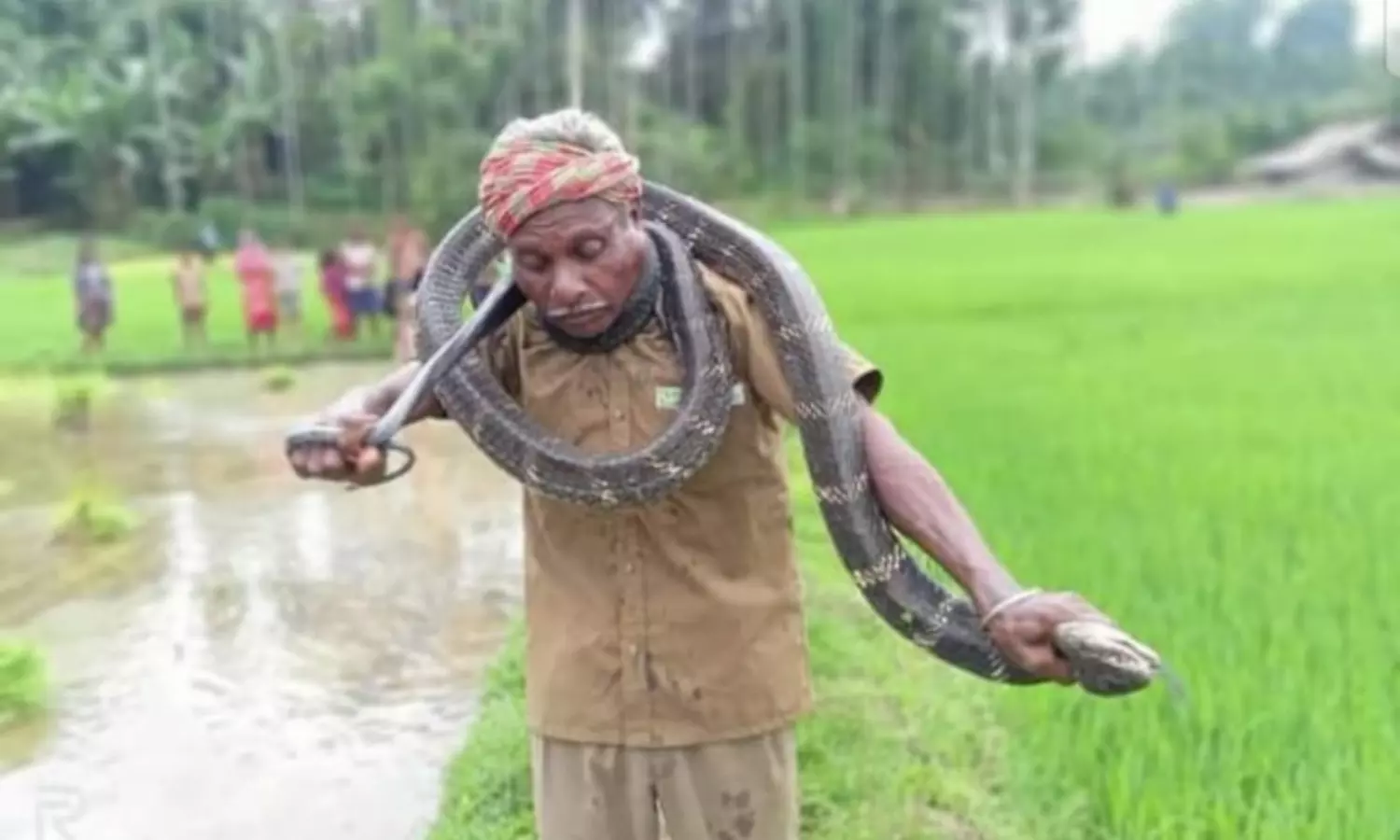 ഞായറാഴ്ച ഉച്ച കഴിഞ്ഞ് വയലില് ജോലി ചെയ്യുന്നതിനിടെയാണ് ഭൂമിജ് രാജവെമ്പാലയെ പിടികൂടുന്നത്. രക്ഷപ്പെടാന് ശ്രമിച്ച രാജവെമ്പാലയെ കഴുത്തില് ചുറ്റിയ ശേഷം നാട്ടുകാര്ക്ക് മുന്നില് പ്രദര്ശിപ്പിക്കുകയും ചെയ്തു. നാട്ടുകാര് ഈ രംഗം മൊബൈല് ക്യാമറയില് പകര്ത്തുകയും ചെയ്തു. പാമ്പിന്റെ കഴുത്തില് പിടികൂടിയ ഭൂമിജ് പാമ്പിനെ വീണ്ടും വീണ്ടും തന്റെ കഴുത്തിലൂടെ ചുറ്റിയിടുന്നത് വീഡിയോയില് കാണാം. ഒപ്പം ഫോട്ടോക്ക് പോസ് ചെയ്യുന്നുമുണ്ട്.