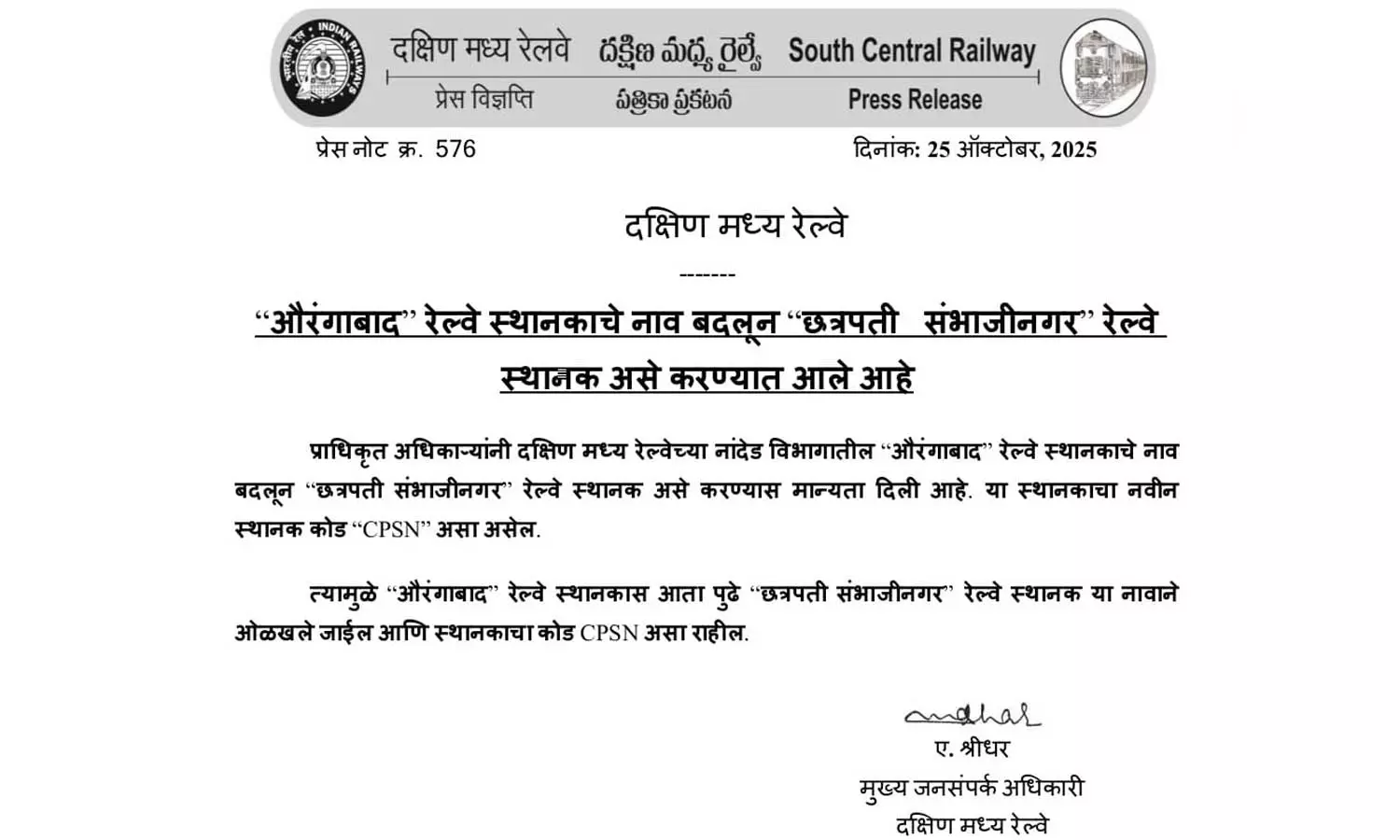 ഇനി 'ഛത്രപതി സംഭാജിനഗർ'; മഹാരാഷ്ട്രയിലെ ഔറംഗാബാദ് റെയിൽവേ സ്റ്റേഷന്റെ പേര് മാറ്റി സെൻട്രൽ റെയിൽവേ