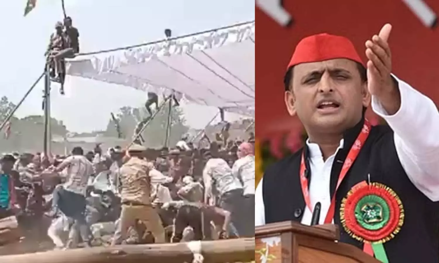 അണപൊട്ടി ആവേശം,സുരക്ഷാ വലയം ഭേദിച്ച് പ്രവർത്തകർ തള്ളിക്കയറി; അഖിലേഷ് യാദവിന്റെ റാലിയിൽ സംഘർഷം