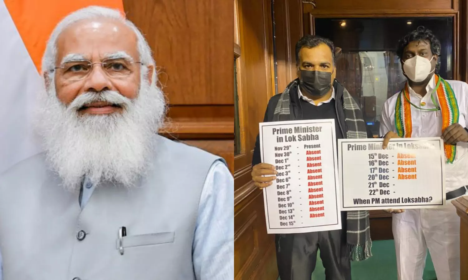 കോണ്ഗ്രസ് എം.പിമാരായ മാണിക്കം ടാഗോറും വിജയ് വസന്തും മോദിയുടെ ഹാജര് നില സൂചിപ്പിക്കുന്ന പ്ലക്കാര്ഡും പിടിച്ച് നില്ക്കുന്ന ഫോട്ടോയാണ് സമൂഹ മാധ്യമങ്ങളില് പ്രചരിക്കുന്നത്. പ്രധാനമന്ത്രി എന്ന് ലോക്സഭയിലെത്തുമെന്ന ചോദ്യവും പ്ലക്കാര്ഡിലുണ്ട്. ഹാജര് വിഷയത്തില് സ്വയം മാറണമെന്നും അല്ലെങ്കില് മാറ്റമുണ്ടാകുമെന്നും എം.പിമാരെ വിമര്ശിച്ച മോദി തന്നെ പാര്ലമെന്റില് ഹാജരാകാതിരുന്നതാണ് വ്യാപകമായി ചര്ച്ചചെയ്യപ്പെടുന്നത്. ഇക്കഴിഞ്ഞ ബി.ജെ.പി പാര്ലമെന്ററി പാര്ട്ടി യോഗത്തിലായിരുന്നു പ്രധാനമന്ത്രി എം.പിമാരെ വിമര്ശിച്ചത്.