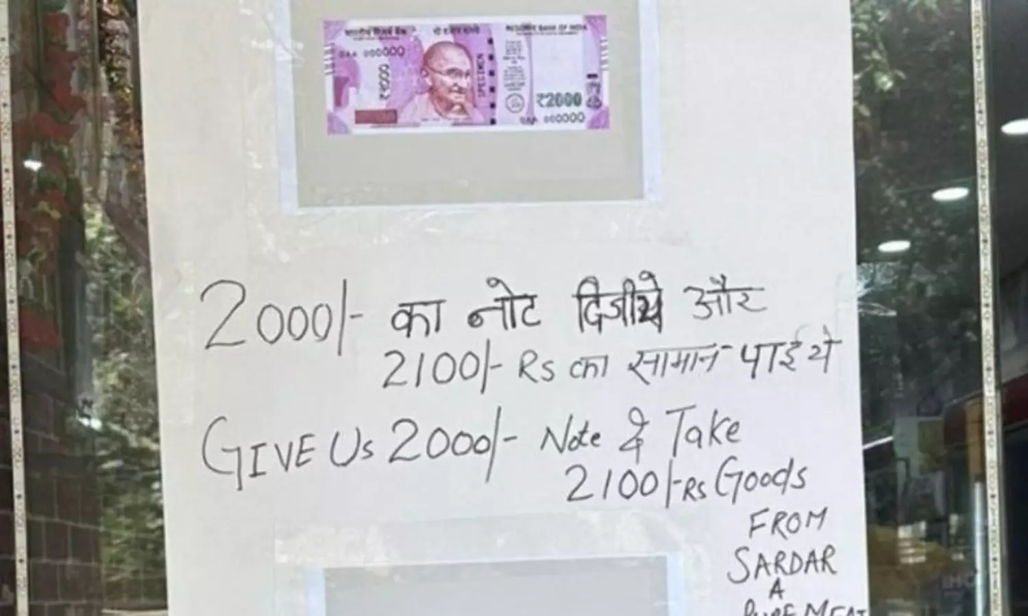 ന്യൂഡൽഹി: 2000 രൂപയുടെ നോട്ട് റിസർവ് ബാങ്ക് ഓഫ് ഇന്ത്യ പിൻവലിച്ചതോടെ അവ കയ്യിലുള്ള പലരും അത് ചെലവാക്കാനും മാറ്റിയെടുക്കാനുമുള്ള തത്രപ്പാടിലാണ്. എന്നാൽ അങ്ങനെ ബുദ്ധിമുട്ടേണ്ടെന്ന് മാത്രമല്ല, തങ്ങളുടെ കടയിൽ വന്ന് 2000 രൂപ തന്ന് 2100 ന്റെ സാധനങ്ങൾ നേടൂവെന്ന് പരസ്യം ചെയ്തിരിക്കുകയാണ് ഒരു കടയുടമ. ഡൽഹി ജി.ടി.ബി നഗറിലെ ഇറച്ചിക്കടയിലാണ് ഈ പരസ്യം പ്രദർശിപ്പിച്ചിരിക്കുന്നത്.