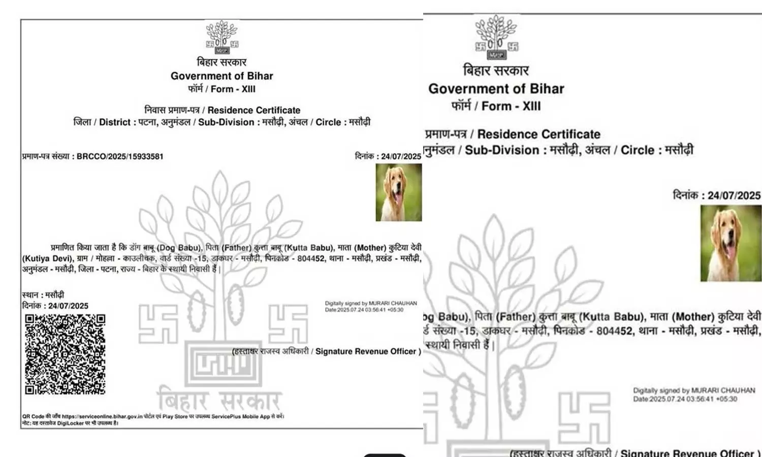 സര്ട്ടിഫിക്കറ്റിലെ ഡിജിറ്റല് ഒപ്പ് റവന്യൂ ഓഫീസര് മുരാരി ചൗഹാന്റേതായിരുന്നു. BRCCO 2025 എന്ന സര്ട്ടിഫിക്കറ്റ് നമ്പറില് രേഖപ്പെടുത്തിയിരിക്കുന്ന പേര് ഡോഗ് ബാബു എന്നാണ്. അച്ഛന്റെ പേരിന്റെ സ്ഥാനത്ത് കുട്ട ബാബു എന്നും അമ്മയുടെ പേരിന്റെ ഭാഗത്ത് കുട്ടിയ ദേവി എന്നുമാണ് സര്ട്ടിഫിക്കറ്റിലുള്ളത്.