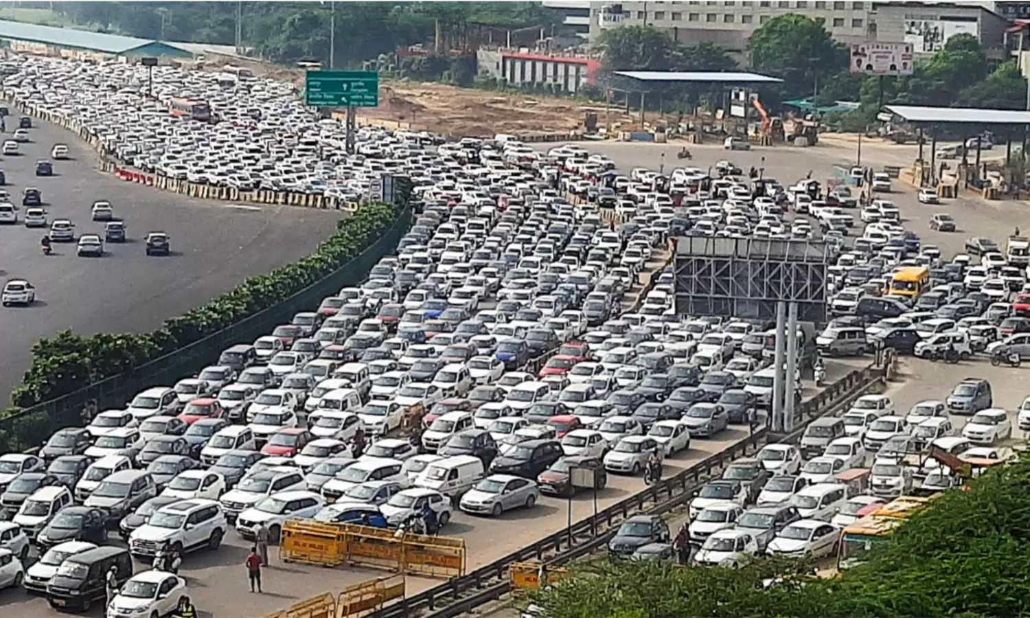Massive traffic snarl seen at Gurugram-Delhi border as vehicles entering the national capital are being checked by Delhi Police and paramilitary jawans, in wake of Bharat Bandh called by farmer organisations today. pic.twitter.com/dclgkqp3X1