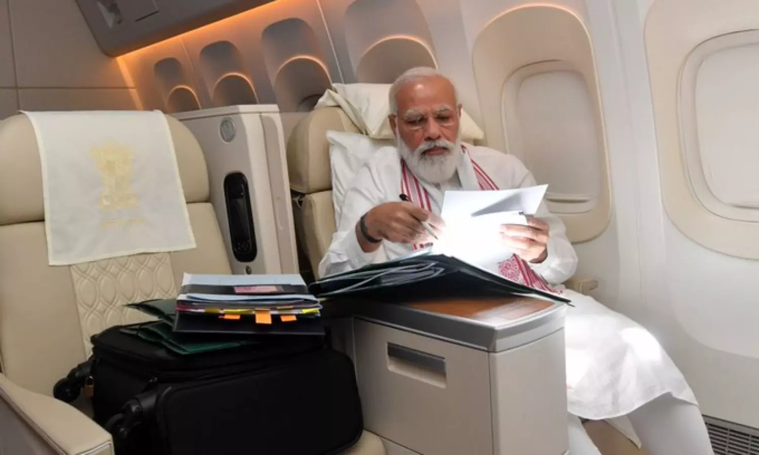 യാത്രക്കിടെ ഫയലുകള് നോക്കുന്ന ചിത്രമാണ് മോദി ട്വിറ്ററില് പങ്കുവെച്ചത്. ഒരു നീണ്ട വിമാനയാത്ര നിരവധി ഫയലുകൾ പരിശോധിക്കുന്നതിനുള്ള അവസരം കൂടിയാണ് നൽകുന്നതെന്നായിരുന്നു മോദി ചിത്രത്തിനൊപ്പം കുറിച്ചത്. ഇതിനുപിന്നാലെയാണ് ചിത്രം സമൂഹമാധ്യമങ്ങളില് വൈറലാകുന്നത്. തുടര്ന്ന് ഇത് ആദ്യത്തെ സംഭവമല്ലെന്നും എല്ലാ പ്രധാനമന്ത്രിമാരും ഇങ്ങനെ ചെയ്യാറുണ്ടെന്നും ചൂണ്ടിക്കാട്ടി നിരവധി കമന്റുകളാണ് വന്നുകൊണ്ടിരിക്കുന്നത്.