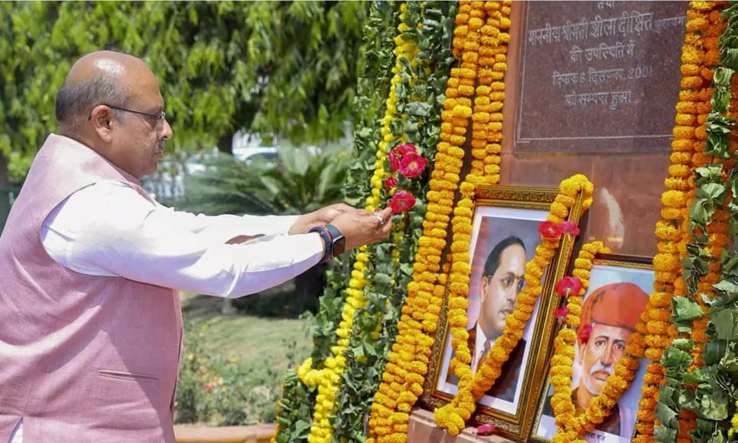 ജ്യോതിബ ഫുലെയുടെ ചിത്രത്തിന് മുന്നിൽ പുഷ്പാർചനയർപ്പിക്കുന്ന ഡൽഹി സ്പീക്കർ വിജേന്ദർ ഗുപ്ത | Photo | PTI