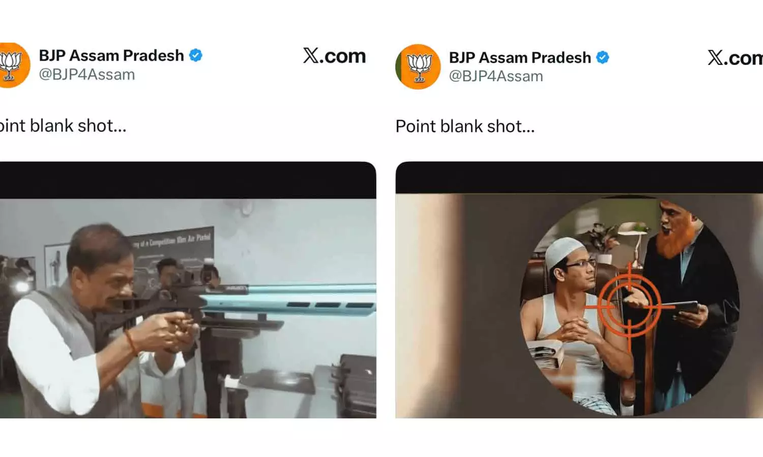 ഗുവാഹതി: മുസ്ലിംകൾക്ക് നേരെ പ്രതീകാത്മകമായി വെടിയുതിർക്കുന്ന അസം മുഖ്യമന്ത്രി ഹിമന്ത ബിശ്വ ശർമയുടെ വീഡിയോ പങ്കുവെച്ച് ബിജെപി. അസം ബിജെപിയുടെ ഔദ്യോഗിക എക്സ് പേജിലാണ് പോയിന്റ് ബ്ലാങ്കിൽ വെടിയുതിർക്കുന്ന ഹിമന്തയുടെ വീഡിയോ പോസ്റ്റ് ചെയ്തിരിക്കുന്നത്. 'പോയിന്റ് ബ്ലാങ്ക് ഷൂട്ട്' എന്ന ക്യാപ്ഷനോടെയാണ് വീഡിയോ.