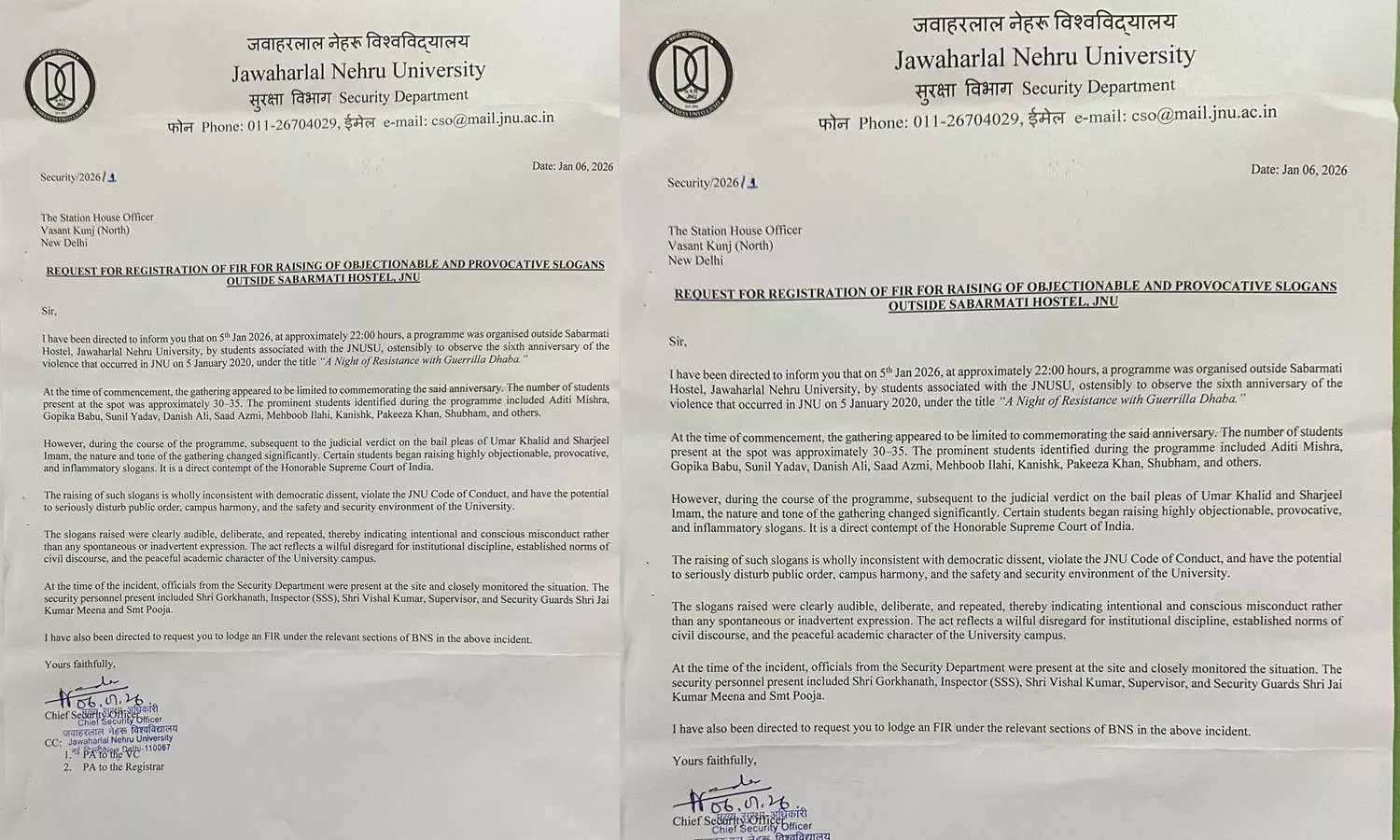"ഉമർ ഖാലിദിന്റെയും ഷർജീൽ ഇമാമിന്റെ ജാമ്യാപേക്ഷയിൽ വിധി വന്നതിനെ തുടര്ന്ന് പ്രതിഷേധത്തിന്റെ സ്വരം മാറി. ചില വിദ്യാർത്ഥികൾ അങ്ങേയറ്റം ആക്ഷേപകരവും പ്രകോപനപരവും പ്രകോപനപരവുമായ മുദ്രാവാക്യങ്ങൾ ഉയർത്താൻ തുടങ്ങി. ഇത് ബഹുമാനപ്പെട്ട സുപ്രിംകോടതിയോടുള്ള നേരിട്ടുള്ള അവഹേളനമാണ്" എന്ന് ജെഎൻയു ചീഫ് സെക്യൂരിറ്റി ഓഫീസർ നവീൻ യാദവ് പറഞ്ഞു.