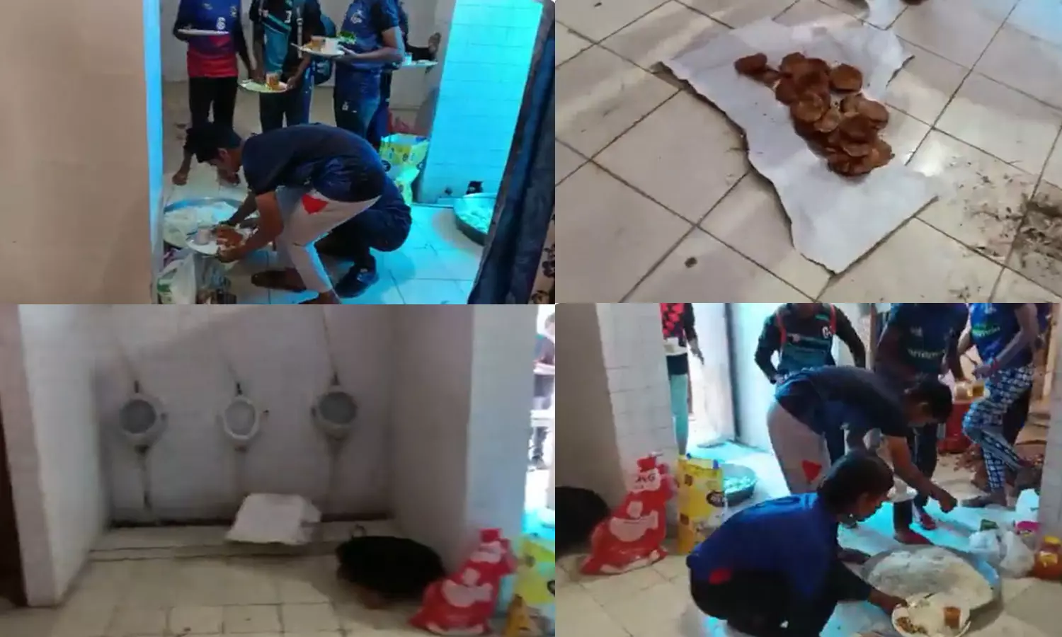 പെൺകുട്ടികൾ പുരുഷന്മാരുടെ കക്കൂസിന്റെ തറയിൽ വച്ചിരിക്കുന്ന ചോറും കറികളും പൂരിയും സ്വന്തമായി പ്ലേറ്റുകളിലാക്കി കഴിക്കാനെടുത്തു കൊണ്ടുപോകുന്ന വീഡിയോ പുറത്തുവന്നു. തറയിലൊരു പേപ്പറിലാണ് പൂരി വച്ചിരിക്കുന്നത്.