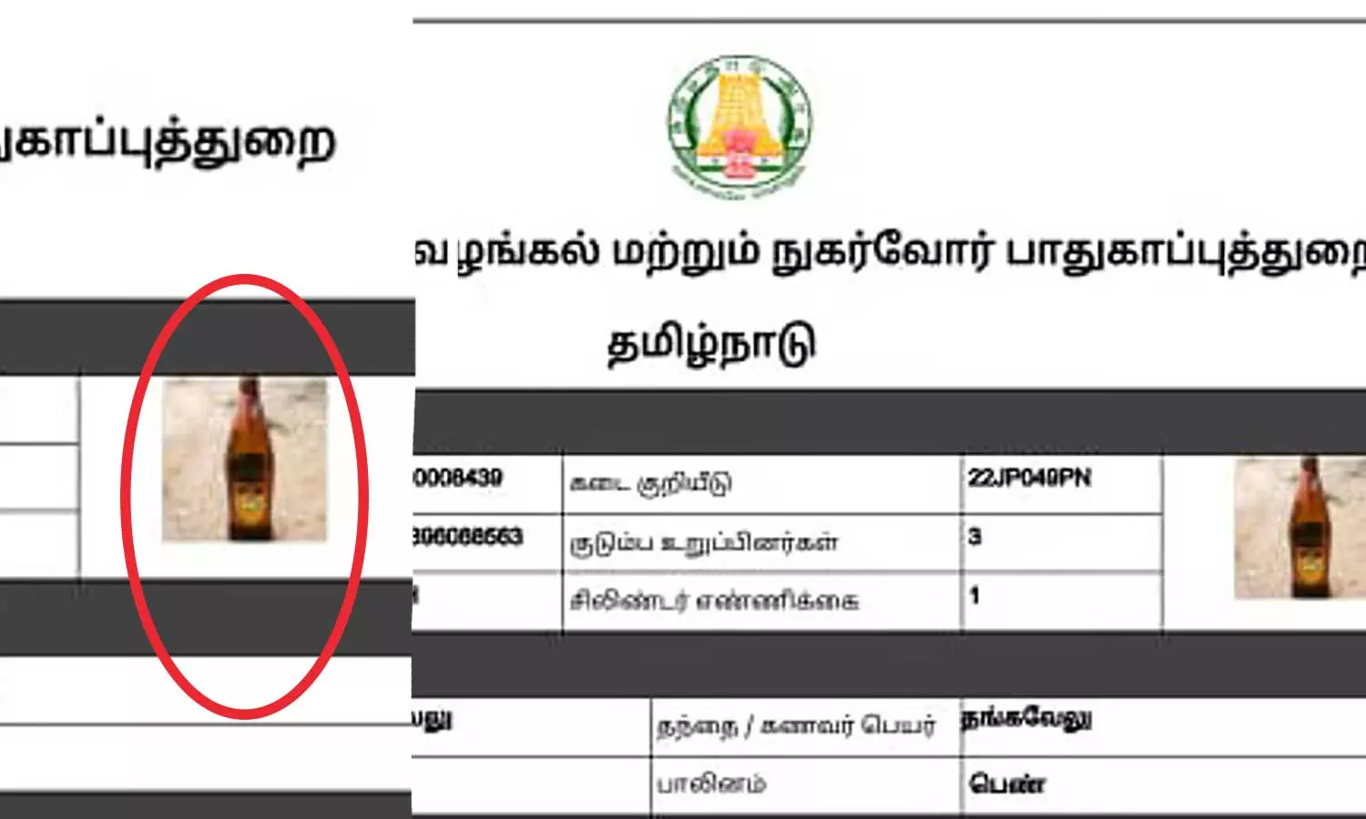 റേഷൻ കാർഡിന്റെ ഒറിജനല് കോപ്പിയിൽ യഥാര്ഥ ഫോട്ടോയാണെന്നും ഇ കോപ്പിയില് മദ്യക്കുപ്പിയുടെ ഫോട്ടോ കണ്ടപ്പോള് ഞെട്ടിപ്പോയെന്നും കുടുംബം പറഞ്ഞു. ഇക്കാര്യം പ്രാദേശിക ഉദ്യോഗസ്ഥരെ അറിയിച്ചിട്ടുണ്ടെന്നും തങ്കവേല് കൂട്ടിച്ചേർത്തു.