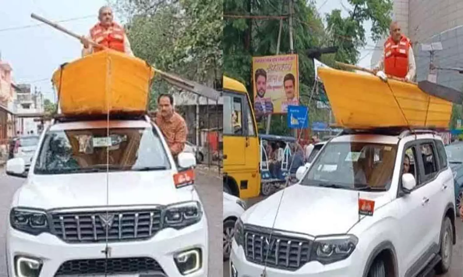 വെള്ളക്കെട്ട്: കാറിനു മുകളില് തോണി കെട്ടിവെച്ച് അതിലിരുന്ന് എം.എല്.എയുടെ പ്രതിഷേധം, പിഴയിട്ട് പൊലീസ്