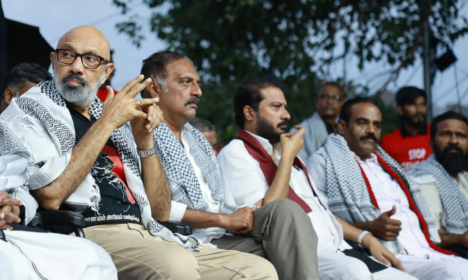ഫലസ്തീന് വിഷയം പരിഹരിക്കുന്നതിന് വേണ്ടി ലോകരാഷ്ട്രങ്ങൾ ഇടപെടണമെന്ന് തമിഴ് നടൻ സത്യരാജ് ആവശ്യപ്പെട്ടു. കൊലപാതകങ്ങൾ തടയാൻ ഐക്യരാഷ്ട്രസഭ തീരുമാനമെടുക്കണമെന്നും അദ്ദേഹം പറഞ്ഞു. 'മനുഷ്യർ വിമോചനത്തിനായി പോരാടുമ്പോഴെല്ലാം വംശഹത്യ നടക്കുന്നു.' സത്യരാജ് പറഞ്ഞു. 'ഇത്തരം പരിപാടികളിൽ പങ്കെടുക്കുക എന്നത് എന്നെപ്പോലുള്ള കലാകാരന്മാരുടെ കടമയാണ്. നമ്മുടെ പ്രശസ്തി മാനവികതയ്ക്കും സ്വാതന്ത്ര്യത്തിനും വേണ്ടി പ്രവർത്തിക്കുന്നില്ലെങ്കിൽ ജനപ്രിയ അഭിനേതാക്കളായിരിക്കുന്നതുകൊണ്ട് പ്രയോജനമില്ല.' സത്യരാജ് കൂട്ടിച്ചേർത്തു.