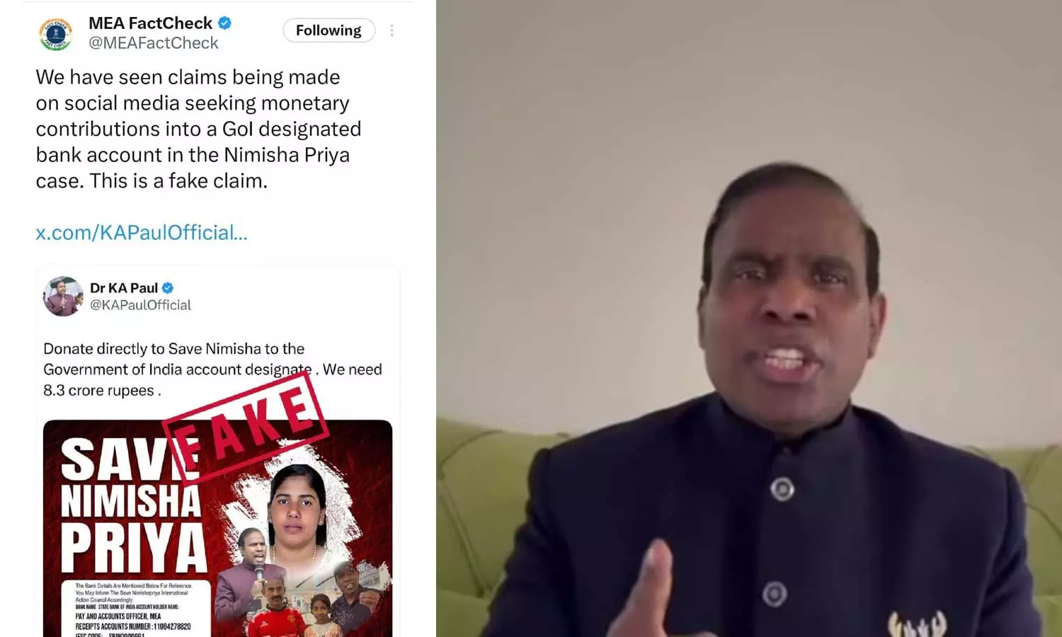 നിമിഷപ്രിയയുടെ മോചനത്തിനായി പണപ്പിരിവ്; കെ.എ പോളിന്റെ അവകാശവാദം വ്യാജമെന്ന് വിദേശകാര്യ മന്ത്രാലയം