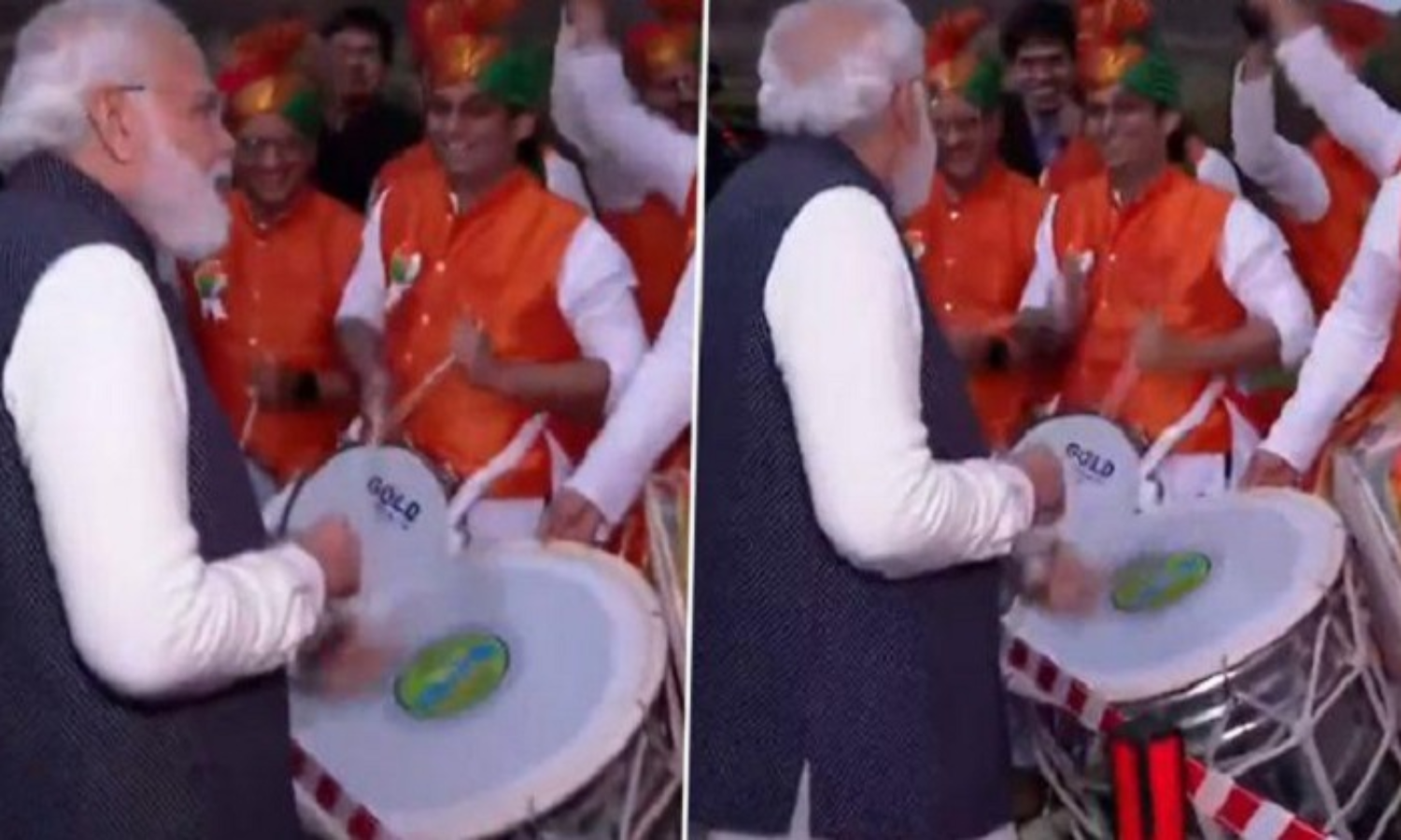 #WATCH PM Modi plays the drums along with members of the Indian community gathered to bid him goodbye before his departure for India from Glasgow, Scotland