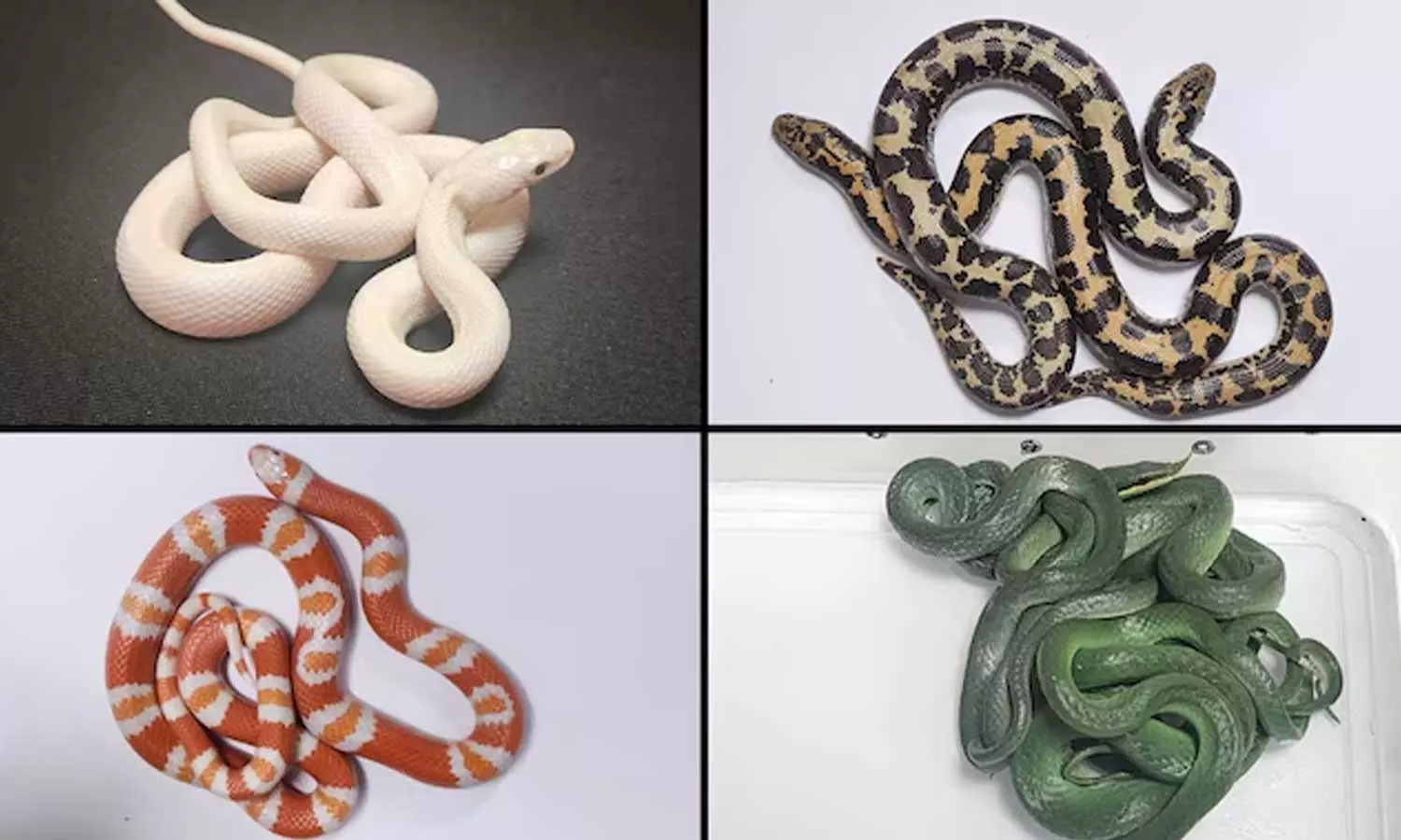 പിടികൂടിയവയില് ഗാര്ട്ടര് പാമ്പുകള്, റൈനോ റാറ്റ് പാമ്പ്, കെനിയന് സാന്ഡ് ബോവ എന്നിവ ഉള്പ്പെടുന്നു. 1962ലെ കസ്റ്റംസ് ആക്ട് പ്രകാരം യാത്രക്കാരനെ അറസ്റ്റ് ചെയ്തു.