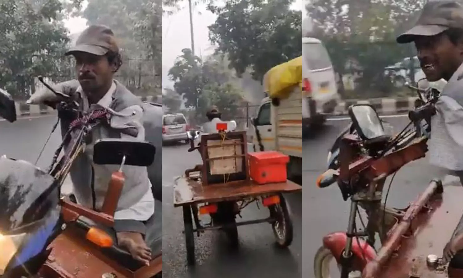 ബൈക്കിന്റെ എൻജിൻ ഉപയോഗിച്ച് സ്വന്തമായി വികസിപ്പിച്ച വാഹനത്തിൽ അധ്വാനിച്ച് കുടുംബം പോറ്റുകയാണ് യുവാവ്. അഞ്ചുവർഷത്തോളമായി തന്റെ ഉപജീവനമാർഗമാണിതെന്ന് വിഡിയോയിൽ അദ്ദേഹം പറയുന്നുണ്ട്. ഇരുകൈകളും മുട്ടിനു താഴോട്ട് പൂർണമായുമില്ല. കാലുകളും സമാനമാണ്. എന്നാൽ, അവശതകൾ പറഞ്ഞ് വീട്ടിലിരിക്കാൻ അദ്ദേഹമില്ല. അവശതകളൊരു ശേഷിയാക്കിമാറ്റുകയായിരുന്നു അദ്ദേഹം.
