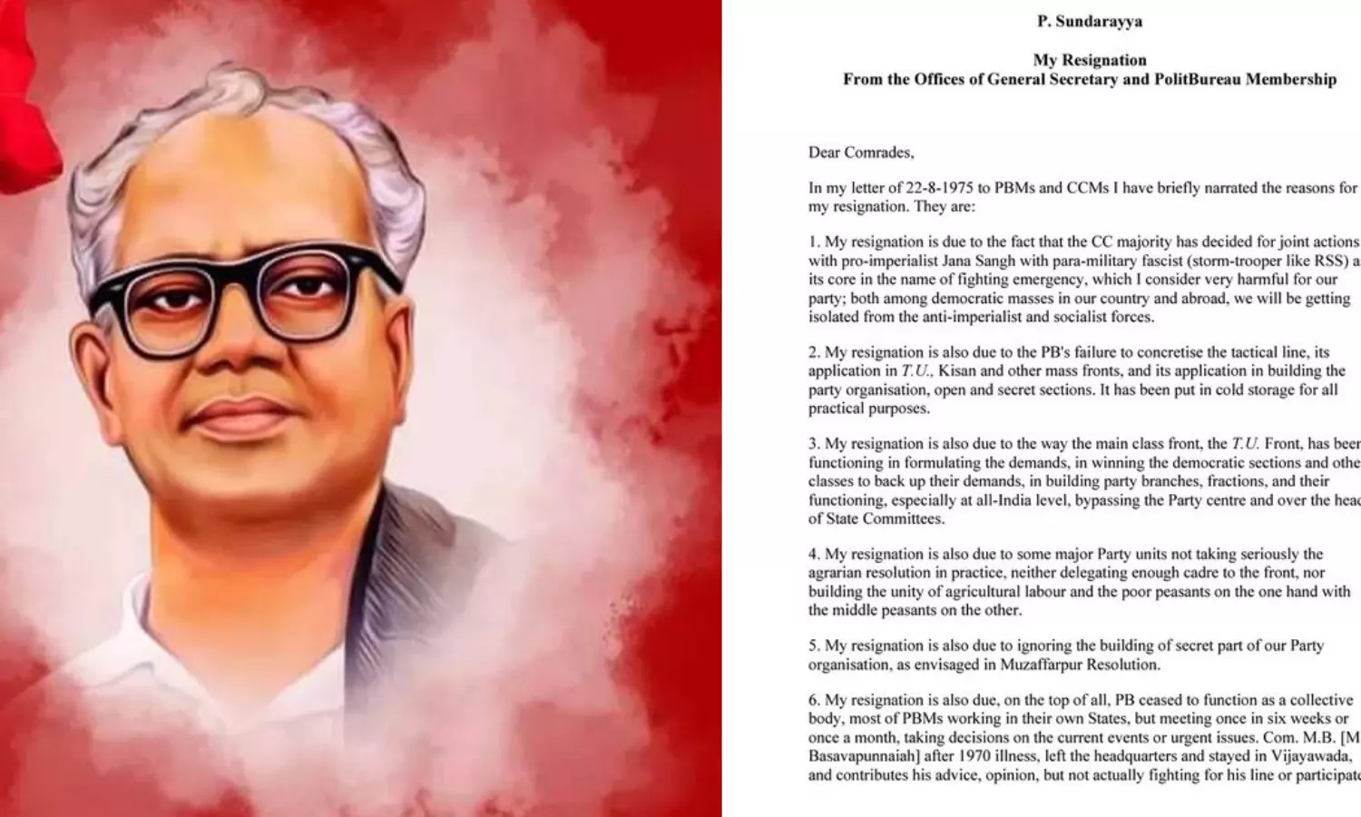 അടിയന്തരാവസ്ഥയെ എതിർക്കാനെന്ന പേരിൽ 1975ൽ ഭാരതീയ ജനസംഘവുമായി സഖ്യമുണ്ടാക്കുന്നതിൽ പ്രതിഷേധിച്ചായിരുന്നു പാർട്ടി ജനറൽ സെക്രട്ടറിയായിരുന്ന പി. സുന്ദരയ്യ പിബി , കേന്ദ്ര കമ്മറ്റി അംഗത്വങ്ങൾ രാജിവെച്ചത്