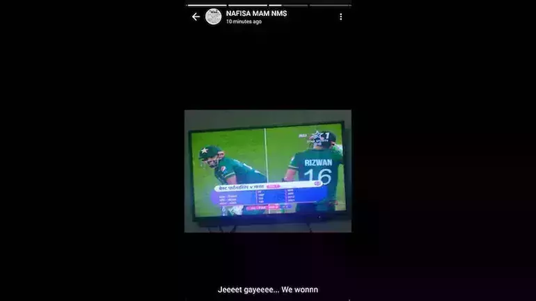 'ഞങ്ങൾ ജയിച്ചു' എന്ന അടിക്കുറിപ്പോടെയാണ് അവർ ഫോട്ടോ പങ്കുവച്ചത്. സ്റ്റാറ്റസ് കണ്ടതോടെ ഒരു കുട്ടിയുടെ രക്ഷിതാവ് നിങ്ങൾ പാകിസ്താനെയാണോ പിന്തുണയ്ക്കുന്നത് എന്നു ചോദിച്ചു. 'അതേ' എന്നായിരുന്നു അധ്യാപികയുടെ മറുപടി. പിന്നാലെ സ്റ്റാറ്റസ് സോഷ്യൽ മീഡിയയിൽ പ്രചരിച്ചു. തുടർന്നാണ് മാനേജ്മെന്റ് ഇവർക്കെതിരെ നടപടിയെടുത്തത്.