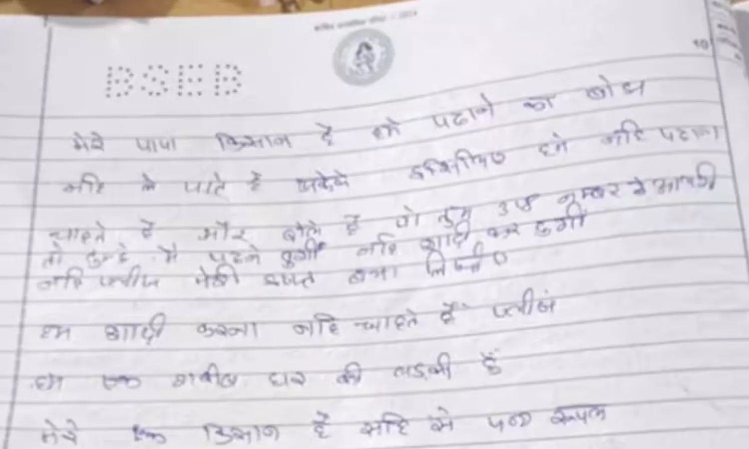 ബിഹാർ: ബിഹാർ പത്താം ക്ലാസ് പരീക്ഷയിലെ ഒരു ഉത്തരക്കടലാസിന്റെ ചിത്രമാണ് സമൂഹമാധ്യമങ്ങളിൽ വൻതോതിൽ പ്രചരിച്ചുകാണ്ടിരിക്കുന്നത്. പലരും ഉത്തരകടലാസിൽ കവിതകളും കഥകളും എഴുതിയപ്പോൾ വളരേ വ്യത്യസ്തവും വികാരഭരിതവുമായ അപേക്ഷയായിരുന്നു ഒരു വിദ്യാർഥിനി തന്റെ ഉത്തകടലാസിൽ കുറിച്ചത്. തന്നെ പരീക്ഷയിൽ ജയിപ്പിക്കണം, തോറ്റാൽ പിതാവ് തന്നെ വിവാഹം കഴിപ്പിച്ചയക്കും എന്നായിരുന്നു കുറിപ്പിന്റെ ഉള്ളടക്കം.