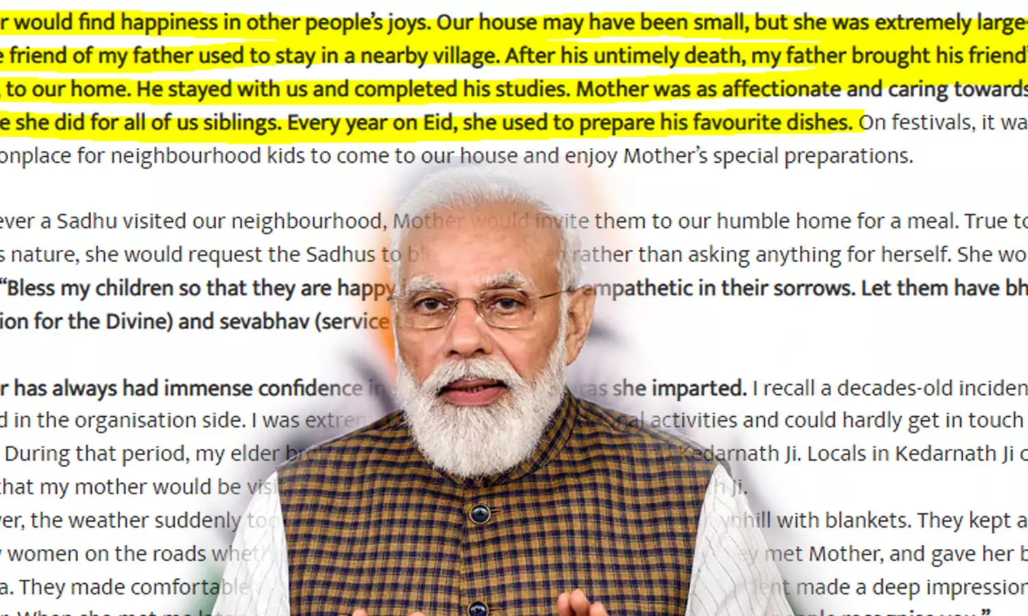 'മറ്റുള്ളവരുടെ ആഹ്ളാദങ്ങളിൽ അമ്മ സന്തോഷം കണ്ടെത്തിയിരുന്നു. ഞങ്ങളുടെ വീട് ചെറുതായിരുന്നെങ്കിലും അവരുടെ ഹൃദയം വിശാലമായിരുന്നു. ഞങ്ങളുടെ ഗ്രാമത്തിനടുത്ത് അച്ഛന്റെ സുഹൃത്ത് താമസിച്ചിരുന്നു. അസമയത്തുള്ള അദ്ദേഹത്തിന്റെ മരണശേഷം എന്റെ അച്ഛൻ സുഹൃത്തിന്റെ മകൻ, അബ്ബാസിനെ വീട്ടിൽ കൊണ്ടുവന്നു. ഞങ്ങൾക്കൊപ്പം താമസിച്ചാണ് അവൻ പഠനം പൂർത്തിയാക്കിയത്. ഞങ്ങൾ സഹോദരങ്ങളോടെന്ന പോലെ അമ്മയ്ക്ക് അവനോട് വാത്സല്യവും കരുതലുമുണ്ടായിരുന്നു. എല്ലാ വർഷവും പെരുന്നാളിൽ അമ്മ അവന് ഇഷ്ടപ്പട്ട ഭക്ഷണം പാചകം ചെയ്തു കൊടുത്തു. ആഘോഷങ്ങളിൽ അടുത്തുള്ള വീട്ടിലെ കുട്ടികളെല്ലാം ഞങ്ങളുടെ വീട്ടിലെത്തി അമ്മയുടെ പ്രത്യേക വിഭവങ്ങൾ ആസ്വദിക്കുമായിരുന്നു' - മോദി എഴുതി.