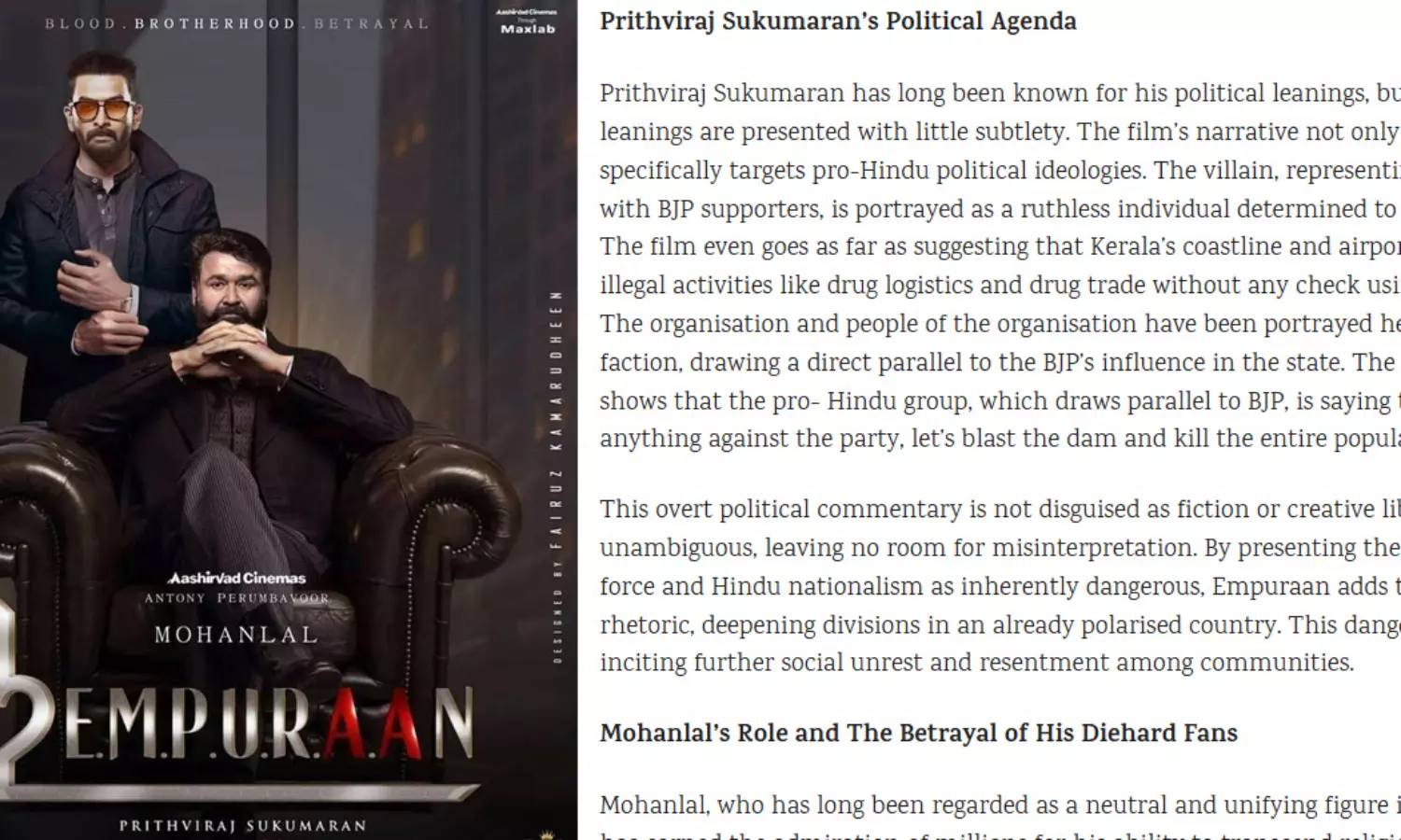 സിനിമയുടെ ആഖ്യാനം ഹിന്ദുക്കളെ അധിക്ഷേപിക്കുക മാത്രമല്ല, പ്രത്യേകിച്ച് ഹിന്ദു അനുകൂല രാഷ്ട്രീയ പ്രത്യയശാസ്ത്രങ്ങളെയും ലക്ഷ്യം വയ്ക്കുന്നു. മലയാള സിനിമയിൽ നിഷ്പക്ഷനായി അറിയപ്പെടുന്ന നടനാണ് മോഹൻലാൽ. മതപരവും രാഷ്ട്രീയവുമായ പരിധികൾ മറികടക്കാനുള്ള അദ്ദേഹത്തിന്റെ നിലപാട് ദശലക്ഷണക്കിനാളുകളുടെ പ്രശംസ നേടിയിട്ടുണ്ട്. എന്നിരുന്നാലും, അത്തരമൊരു ഭിന്നിപ്പും രാഷ്ട്രീയ പ്രാധാന്യവുമുള്ള ആഖ്യാനത്തെ പ്രോത്സാഹിപ്പിക്കുന്ന ഒരു സിനിമയിൽ അഭിനയിക്കാനുള്ള അദ്ദേഹത്തിന്റെ തീരുമാനം വിശ്വസ്തരായ ആരാധകവൃന്ദത്തോടുള്ള വഞ്ചനയാണെന്നും ലേഖനം ചൂണ്ടിക്കാണിക്കുന്നു.