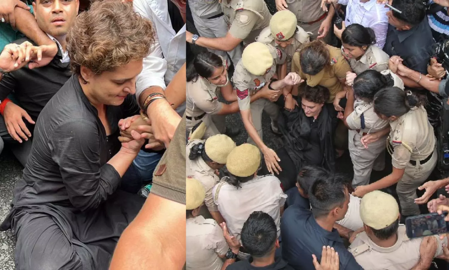 റോഡിൽ കുത്തിയിരുന്ന് പ്രിയങ്ക, തൂക്കിയെടുത്ത് പൊലീസ്; കോൺഗ്രസ് പ്രതിഷേധത്തിൽ നാടകീയ രംഗങ്ങൾ