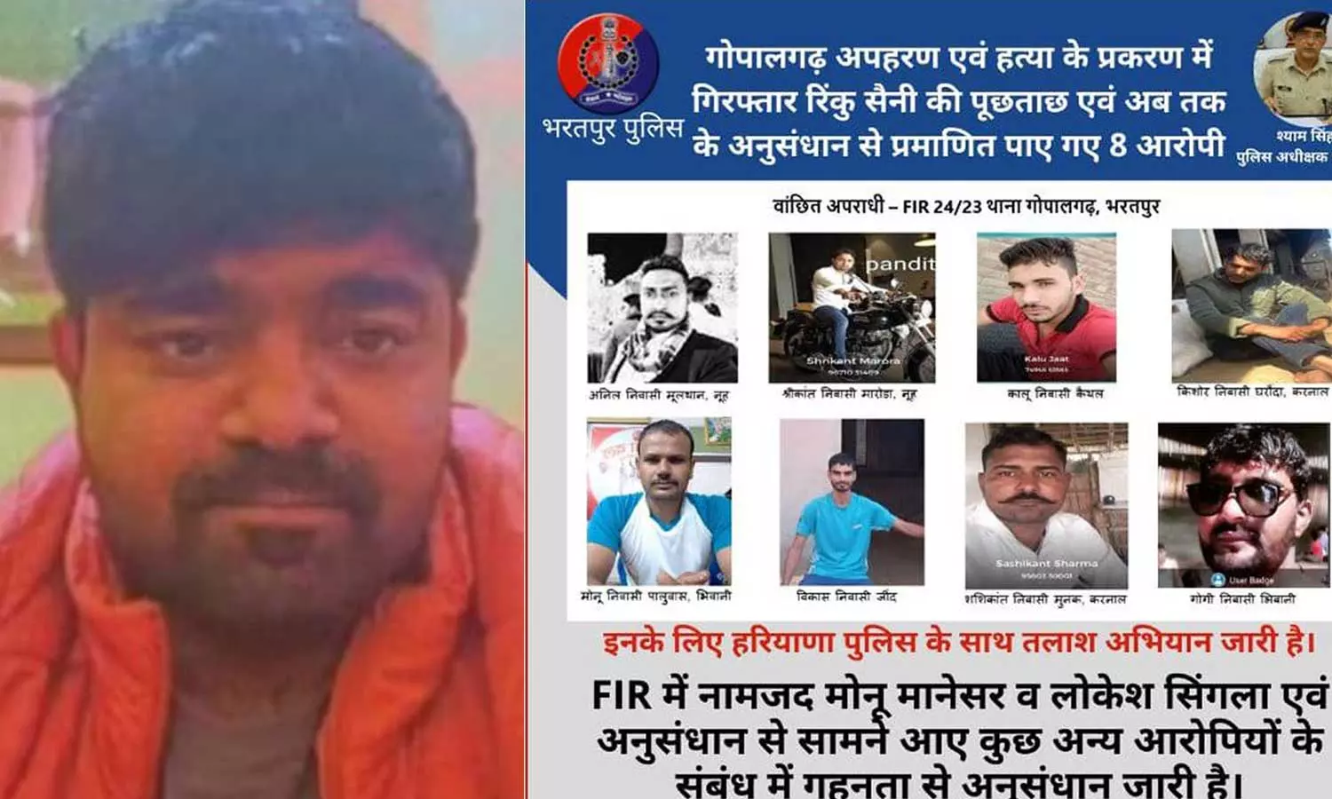 ഭരത്പൂരിൽ സംഘടിപ്പിച്ച വാർത്താ സമ്മേളനത്തിലാണ് 8 പേരുടെ ഫോട്ടോകൾ സഹിതം പൊലീസ് പുറത്തുവിട്ടത്. ഇവരിൽ 2 പേർ നുഹിൽ നിന്നുള്ളവരും 6 പേർ ഹരിയാനയിലെ മറ്റ് ജില്ലകളിൽ നിന്നുള്ളവരുമാണ്. പൊലീസ് റിമാൻഡിലുള്ള റിങ്കു സൈനി കുറ്റം സമ്മതിച്ചതായി ഉദ്യോഗസ്ഥർ പറഞ്ഞു. അനിൽ സ്വദേശി, ശ്രീകാന്ത്, കാലു, കിഷോർ, അനിൽ സ്വദേശിയായ ഭിവാനി, ശശികാന്ത്, വികാസ്, മോനു സ്വദേശി പലുവാസ്, ഭിവാനി എന്നിവരെയാണ് അന്വേഷിക്കുന്നതെന്ന് രാജസ്ഥാൻ പൊലീസ് എഡിജിപി ക്രൈം ദിനേശ് എംഎൻ പറഞ്ഞു.