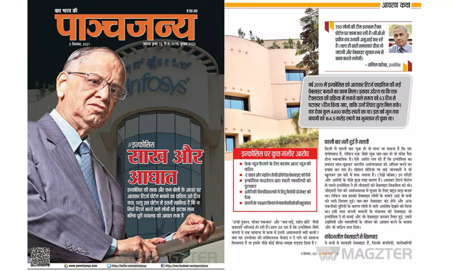 ആദായ നികുതി വകുപ്പിന്റെയും ജി.എസ്.ടിയുടെയും പോര്ട്ടലുകള് വികസിപ്പിക്കാനുള്ള കരാര് ഇന്ഫോസിസിനായിരുന്നു. കഴിഞ്ഞ മാസം ഇത് ഉപയോക്താക്കള്ക്ക് ഉപയോഗിക്കുന്നതില് പ്രയാസം നേരിട്ടതോടെ ഇന്ഫോസിസ് സി.ഇ.ഓയെ ധനമന്ത്രി നിര്മല സീതാരാമന് വിളിച്ചു വരുത്തിയിരുന്നു. ഒരു വിദേശ സര്ക്കാരുമായുള്ള കരാറില് ഇന്ഫോസിസ് ഇങ്ങനെ ഉത്തരവാദിത്തരഹിതമായി പ്രവര്ത്തിക്കുമോയെന്നാണ് പാഞ്ചജന്യയുടെ ചോദ്യം. നികുതി പോര്ട്ടലുകളുമായി ബന്ധപ്പെട്ടാണ് കവര്സ്റ്റോറിയെങ്കിലും മറ്റ് ചില ആരോപണങ്ങള് കൂടി പാഞ്ചജന്യ ഉന്നയിക്കുന്നുണ്ട്. ദ വയര്, സ്ക്രോള്, ആള്ട്ട് ന്യൂസ് തുടങ്ങിയ വെബ് പോര്ട്ടലുകള്ക്ക് ഫണ്ട് നല്കുന്നത് ഇന്ഫോസിസ് ആണെന്നാണ് പാഞ്ചജന്യ ആരോപിക്കുന്നത്. അര്ബന് നക്സലുകള്ക്ക് പുരസ്കാരം നല്കുന്നു, അമേരിക്കയിലെ ഹിന്ദു വിരുദ്ധ പദ്ധതികള്ക്ക് ഫണ്ട് ചെയ്യുന്നു തുടങ്ങിയ ആരോപണങ്ങള്ക്ക് പുറമെ ഇന്ഫോസിസിലെ എച്ച്.ആര് വിഭാഗത്തില് മാര്ക്സിസ്റ്റുകാരുടെ ബാഹുല്യമാണെന്നും പാഞ്ചജന്യ ആരോപിക്കുന്നു.