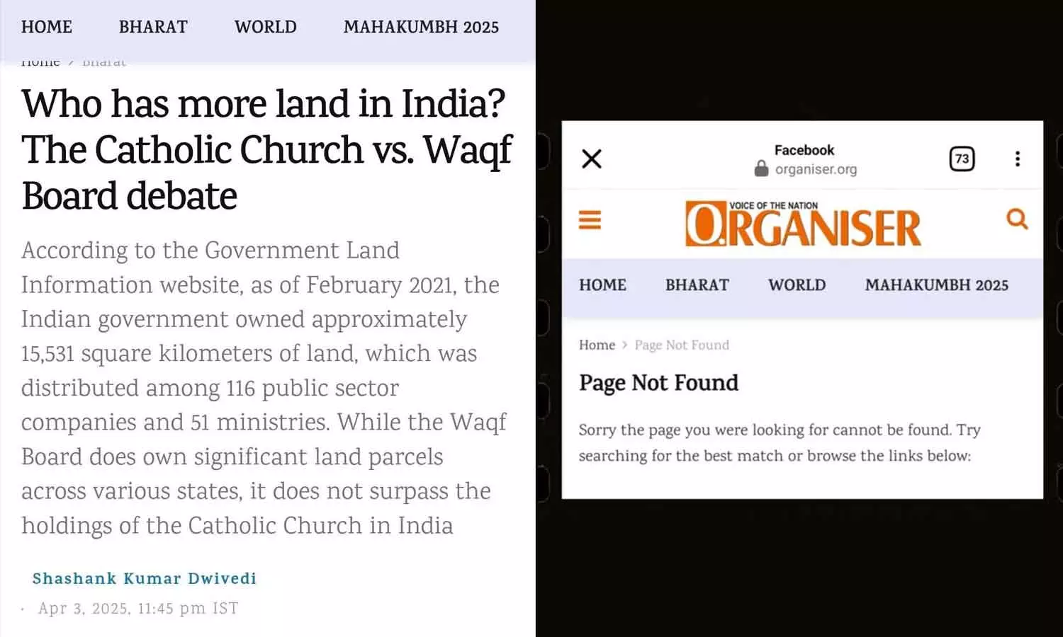 വഖഫ് ബോർഡിനെക്കാൾ ഭൂസ്വത്ത് കത്തോലിക്ക സഭക്ക് എന്ന ലേഖനം മുക്കി ആർഎസ്എസ് വാരിക