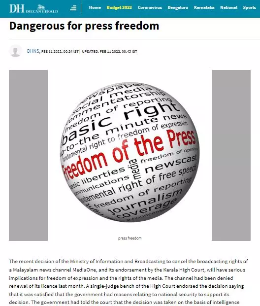 Summary: ''The government can close down any newspaper or TV channel by telling the court that it is a threat to national security, without producing any evidence'', notes Deccan Herald's editorial on MediaOne ban